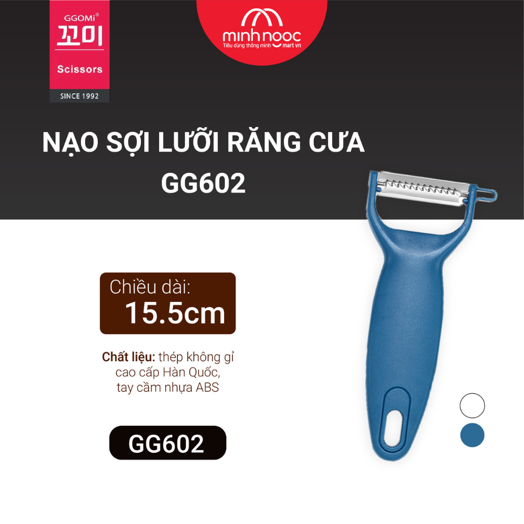 Cùng hình dáng với nạo nhỏ hồng GG601, Ggomi GG602 thiết kế lưỡi răng cưa với hai màu xanh- trắng. Có thể  dùng để gọt vỏ hay bào nạo với hầu hết các loại củ và trái cây, mang lại sự thuận lợi khi sơ chế, chế biến thức ăn. Kiểu dáng đơn giản, gọn nhẹ, lưỡi bằng thép sắc bén rất dễ dàng để gọt vỏ, vừa sắc bén, lại rất sạch sẽ và vệ sinh, không han gỉ