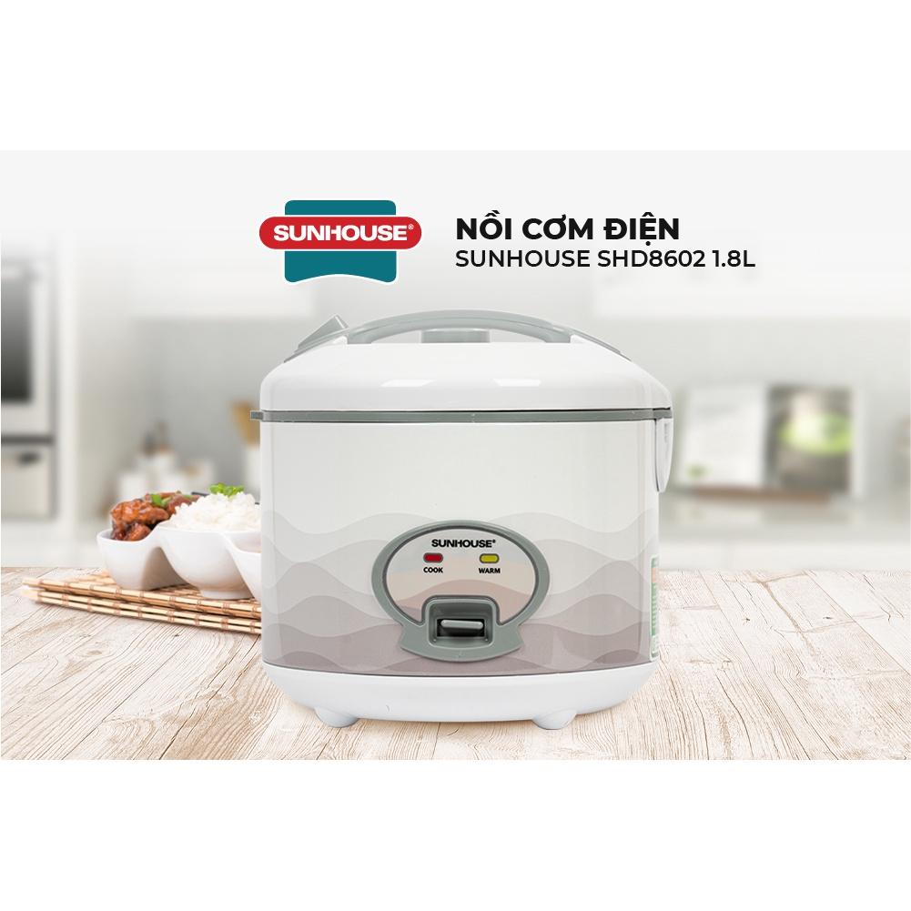 Nồi cơm điện SUNHOUSE 1.8L SHD8602 KIỂU DÁNG TRẺ TRUNG – TIỆN DỤNG VÀ AN TOÀN Thiết kế đơn giản, trẻ trung và an toàn Nồi cơm điện SUNHOUSE 1.8L SHD8602 được thiết kế với