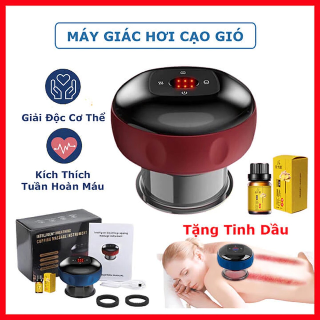 CÔNG DỤNG SẢN PHẨM – Giác hơi kích thích tuần hoàn máu, giải độc; – Là phương pháp an toàn không gây phỏng; – Thiết kế nhỏ gọn, dễ dàng sử dụng; – Sử dụng công nghệ hút chân không an toàn, thay thế cho phương pháp giác hơi bằng lửa truyền thống. ĐẶC ĐIỂM: Sử dụng dễ dàng: Tùy chỉnh nhiệt độ và độ hút của giác theo độ đáp ứng thích hợp của mỗi người với 6 nấc nhiệt và 6 nấc hút. Kết hợp hút chân không và nhiệt. Bình thường giải cơ áp tay và tạo 1 lực xuống cơ thể. Còn giác là hút lên. Giảm áp lực cho xương khớp và cơ. Người bệnh sẽ thấy thoải mái, dễ chịu và hiệu quả rất rõ ràng Kích Thước :11*10cm HƯỚNG DẪN SỬ DỤNG: Máy sẽ hút chân không và làm nóng với liệu trình 20 phút và tự ngắt; 【Máy 6 chế độ】 - 3 đèn hàng trên: Hiển thị 6 mức độ áp suất (1,2,3 từ trái qua phải. Sáng 2 đèn 1+3 là mức 4, 2+3 là mức 5, sáng 3 đèn là mức 6); - 3 đèn hàng dưới: Hiển thị 6 mức độ nhiệt (tương tự như trên, nhiệt độ từ 38-45 độ). Nút dưới: Giữ 3 giây để Bật và Tắt Nút trên: Dừng tăng áp suất Nút bên phải: Điều chỉnh mức độ áp suất Nút bên trái: Điều chỉnh nhiệt độ Máy cạo gió giác hơi là sản phẩm chăm sóc sức khỏe vô cùng tiện lợi. Với nhiệt độ 40-60 độ kết hợp dầu nóng xoa bóp, sản phẩm thích hợp làm ấm toàn thân, cạo gió dọc thăn lưng, châm cứu, massage lưu thông máu huyết, giảm sưng đau các khớp