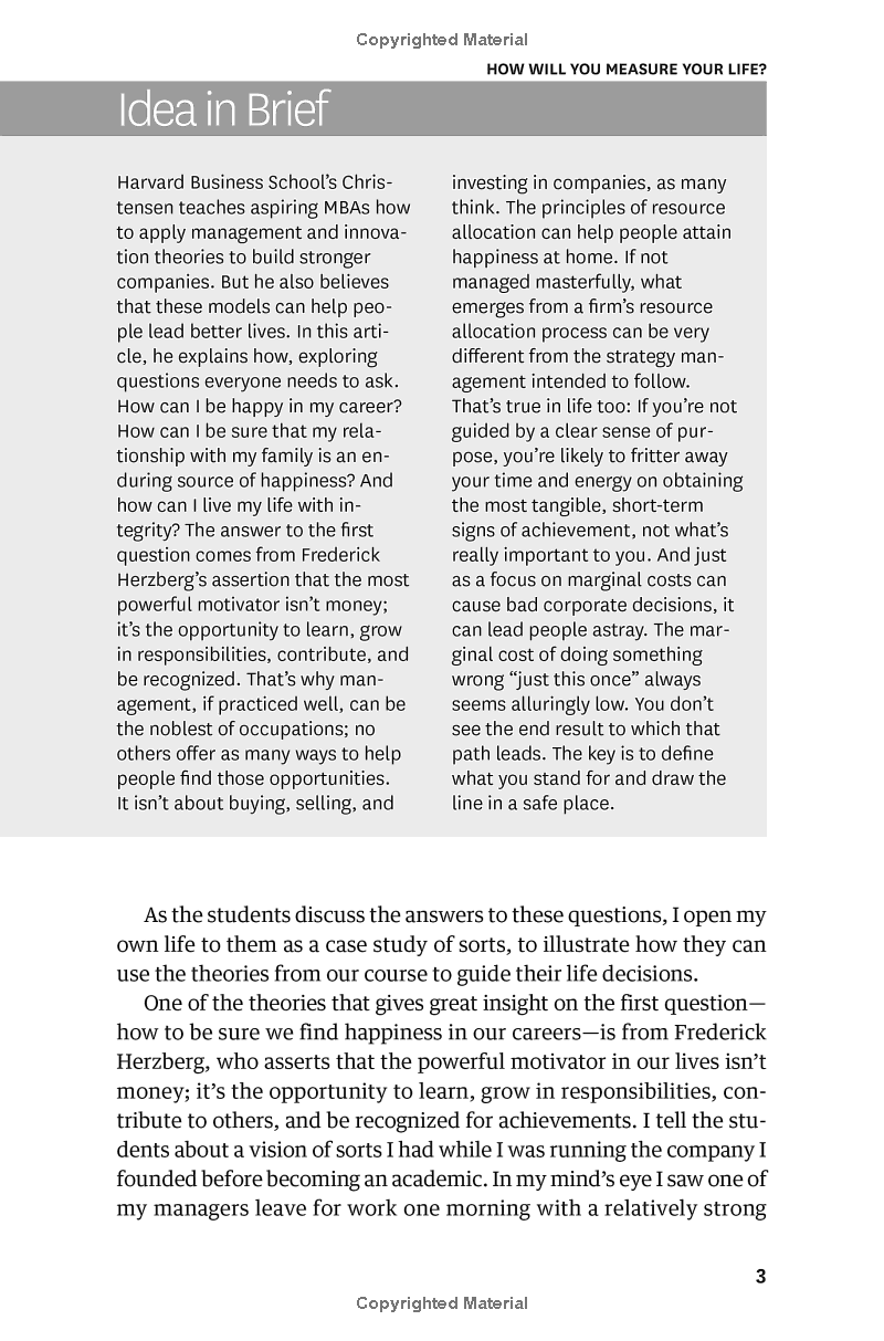 The path to your professional success starts with a critical look in the mirror. If you read nothing else on managing yourself, read these 10 articles (plus the bonus article "How Will You Measure Your Life?" by Clayton M. Christensen). We've combed through hundreds of Harvard Business Review articles to select the most important ones to help you maximize yourself. HBR's 10 Must Reads on Managing Yourself will inspire you to: Stay engaged throughout your 50+-year work life Tap into your deepest values Solicit candid feedback Replenish physical and mental energy Balance work, home, community, and self Spread positive energy throughout your organization Rebound from tough times Decrease distractibility and frenzy Delegate and develop employees' initiative This collection of best-selling articles includes: bonus article "How Will You Measure Your Life?" by Clayton M. Christensen, "Managing Oneself," "Management Time: Who's Got the Monkey?"