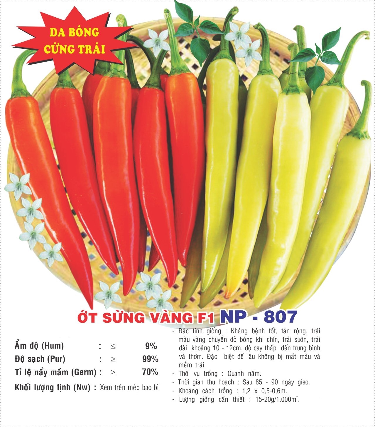 Đặc tính giống: Ớt Sừng Vàng F1 - Giống sinh trưởng khỏe, kháng bệnh tốt, tán rộng, trái màu vàng chuyển đỏ bóng khi chín, năng suất cao, trái suôn dài 10-12cm độ cay trung bình và thơm. Đặc biệt đê lâu không bị mềm và mất màu.