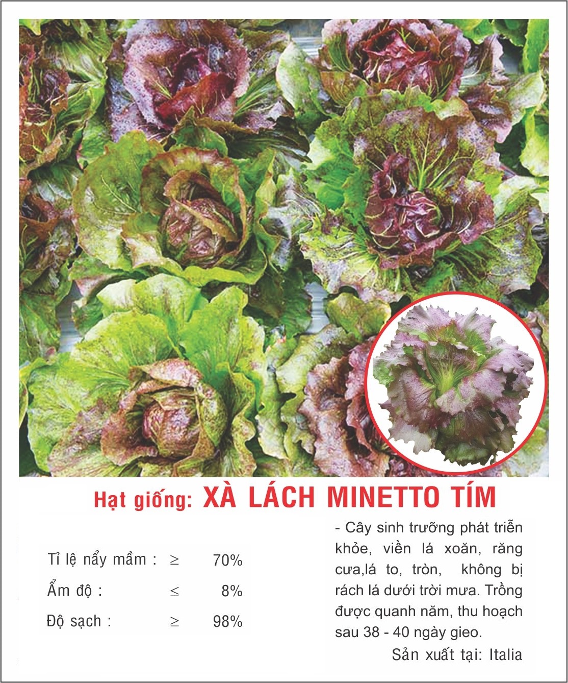 - Lượng giống cần thiết: sạ: 40-50g / 1000 m2 Kỹ thuật trồng Xà lách Minetto Tím: Xà lách Minetto là loại rau xà lách có xuất xứ từ đất nước Italia. Lá xà lách có độ giòn, xanh bóng, răng cưa, xoăn, cuốn búp chặt. Hạt màu đen có thể dùng làm giống cho mùa sau. Đây là loại rau có khả năng chịu nhiệt, chịu ẩm (có thể cuốn bắp ngay ở vùng nhiệt đới đất thấp) và có khả năng kháng bệnh cháy lá tốt. Xà lách thường được dùng ăn sống, trộn salad cùng nhiều loại rau củ khác.