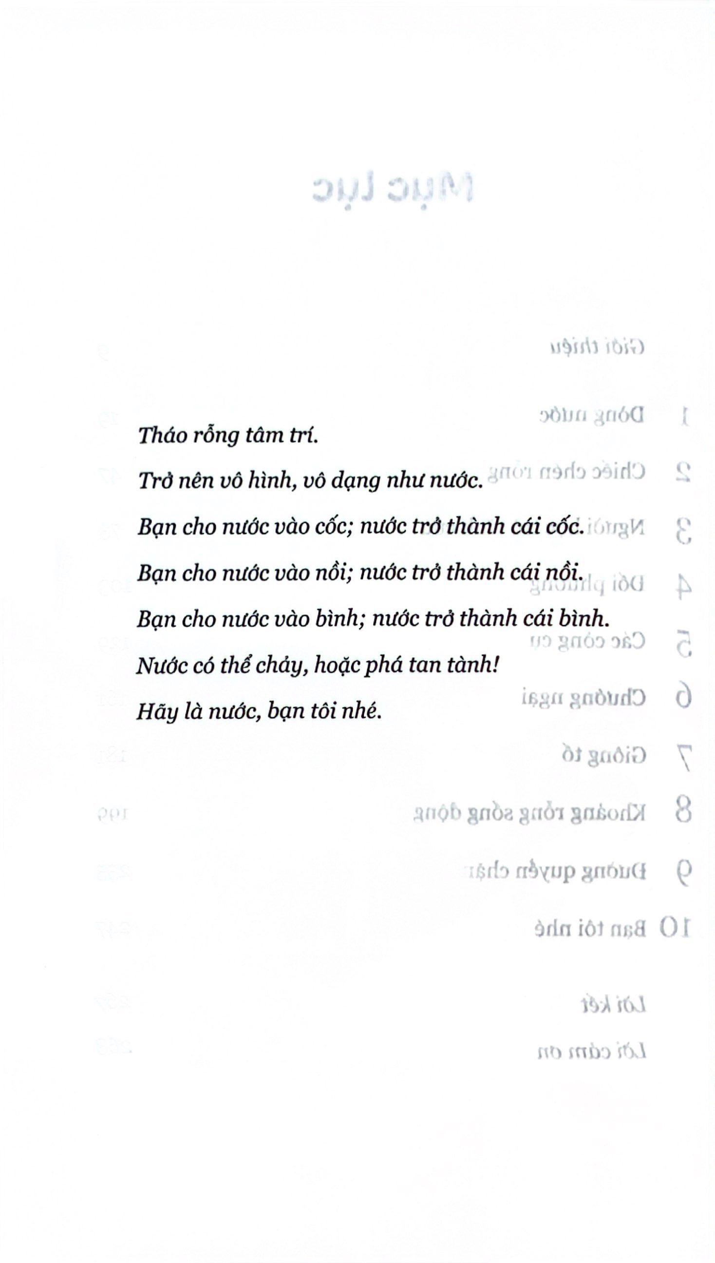 Bản chất của nước là sự chảy. Nước luôn tìm ra cách đi vòng quanh (hoặc thậm chí xuyên qua) các chướng ngại. Đặc điểm ấy, cha tôi gọi là “vô hạn”. Nước hiện diện trọn vẹn trước mọi cảnh huống và môi trường xung quanh nên sẵn sàng chuyển dịch theo bất kỳ hướng nào mà nó có thể chảy qua. Sự cởi mở và dễ uống nắn ấy cho thấy nước luôn ở trạng thái sẵn sàng, nhưng đây là một sự sẵn sàng tự nhiên vì nước chỉ đơn giản đang trọn vẹn là chính nó. Vậy, sống giống như nước tức là nhận biết con người hoàn chỉnh nhất, tự nhiên nhất và được hiện thực hoá cao nhất trong bạn – tức là con người đang sống hết m.ình để tiến bước trên con đường riêng trong dòng chảy của cuộc sống.