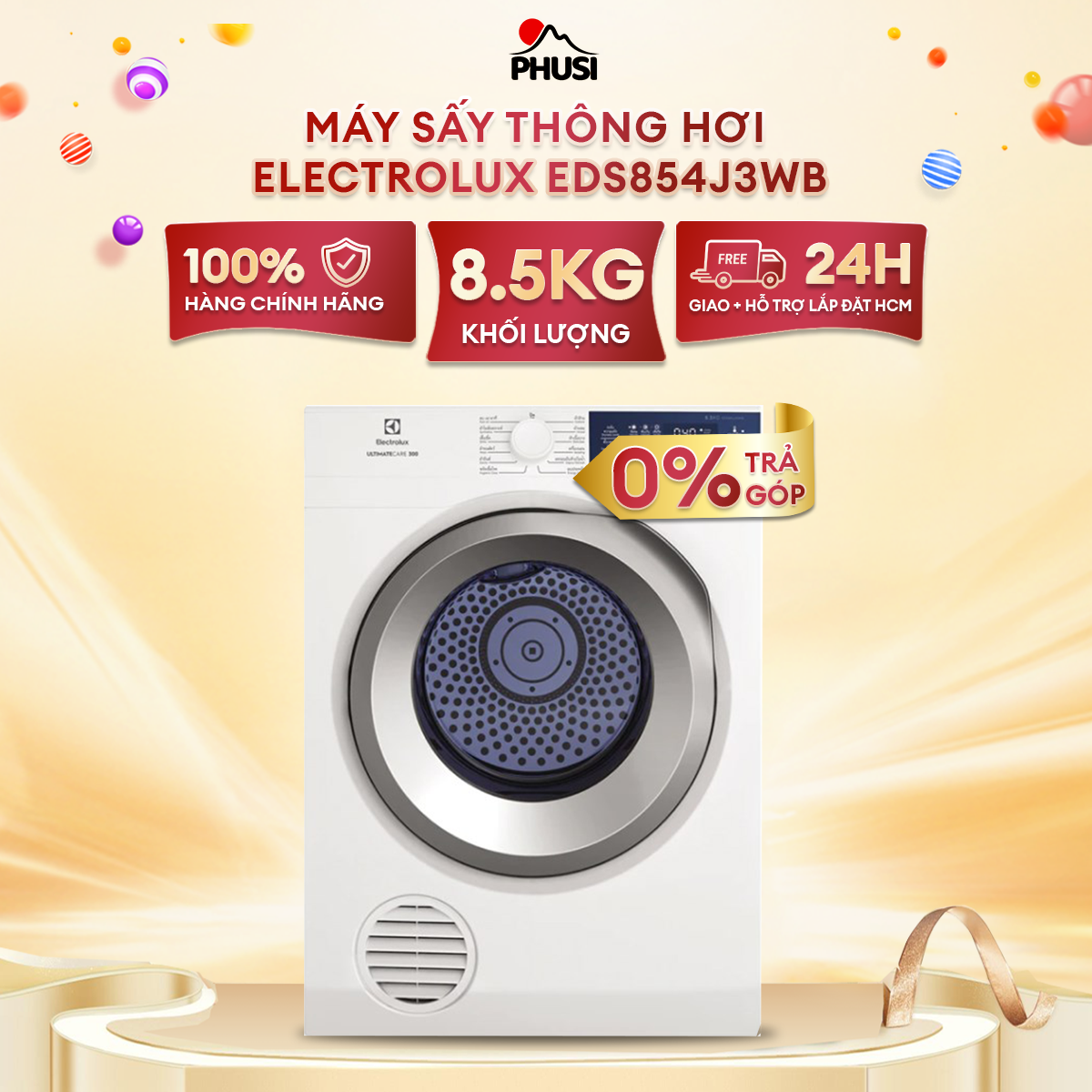 Máy Sấy Thông Hơi Electrolux 8.5 kg EDS854J3WB được bảo hành chính hãng 24 tháng.