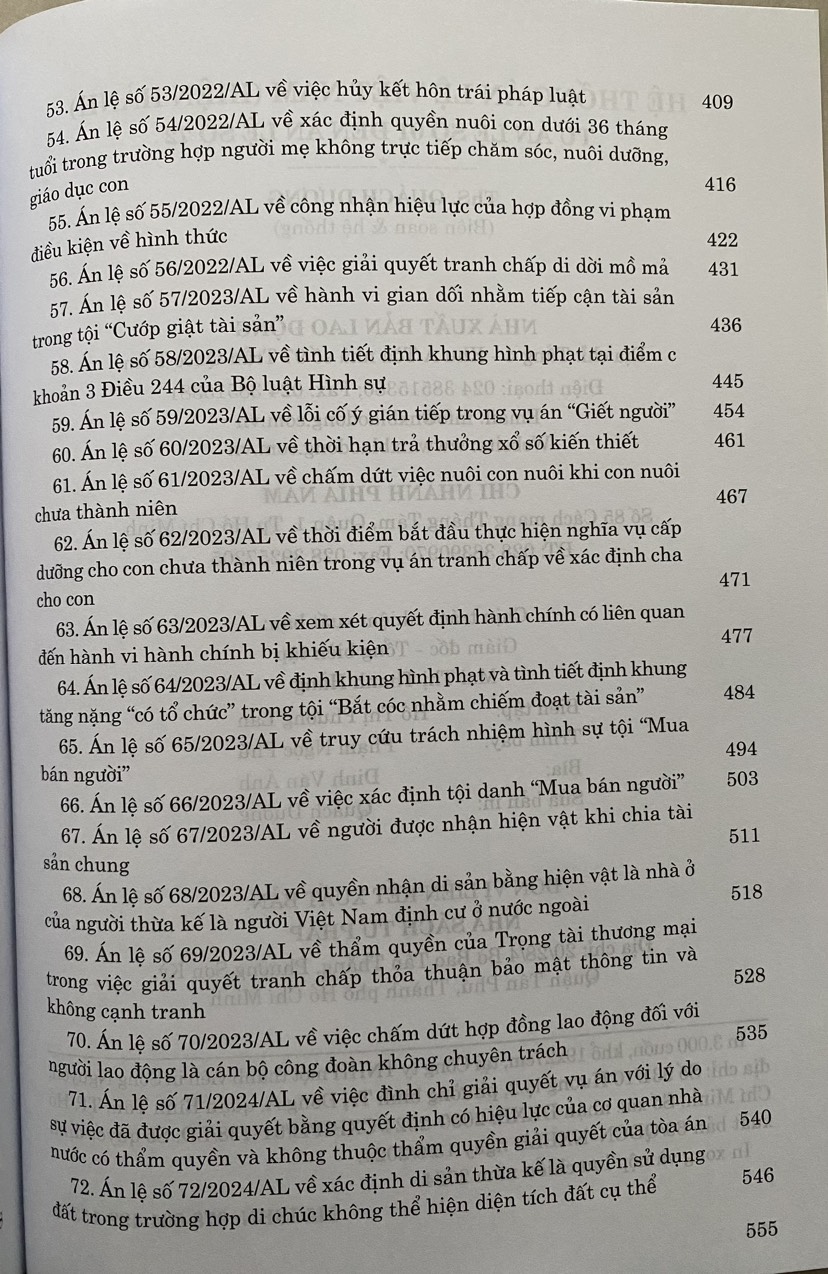 Để thuận tiện cho việc nghiên cứu, tìm hiểu, vận dụng án lệ trong quá trình thực hiện nhiệm vụ xét xử của Tòa án; giúp các cơ quan, tổ chức, cá nhân quan tâm tới hoạt động của Tòa án có thể tiếp cận với các án lệ đã ban hành; tạo nguồn tham khảo cho các hoạt động giảng dạy, nghiên cứu khoa học của các cơ quan, tổ chức, cá nhân, Nhà xuất bản Lao Động cho phát hành cuốn: "Hệ thống Án lệ Việt Nam (Hiện hành) - Từ Án lệ số 01 đến Án lệ số 72".