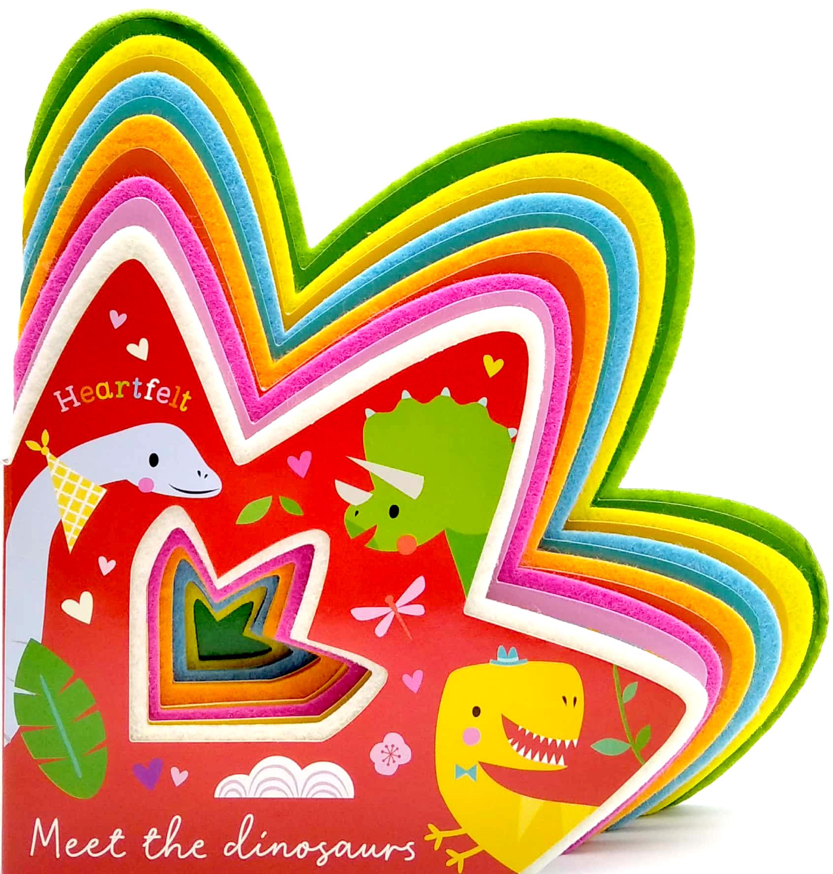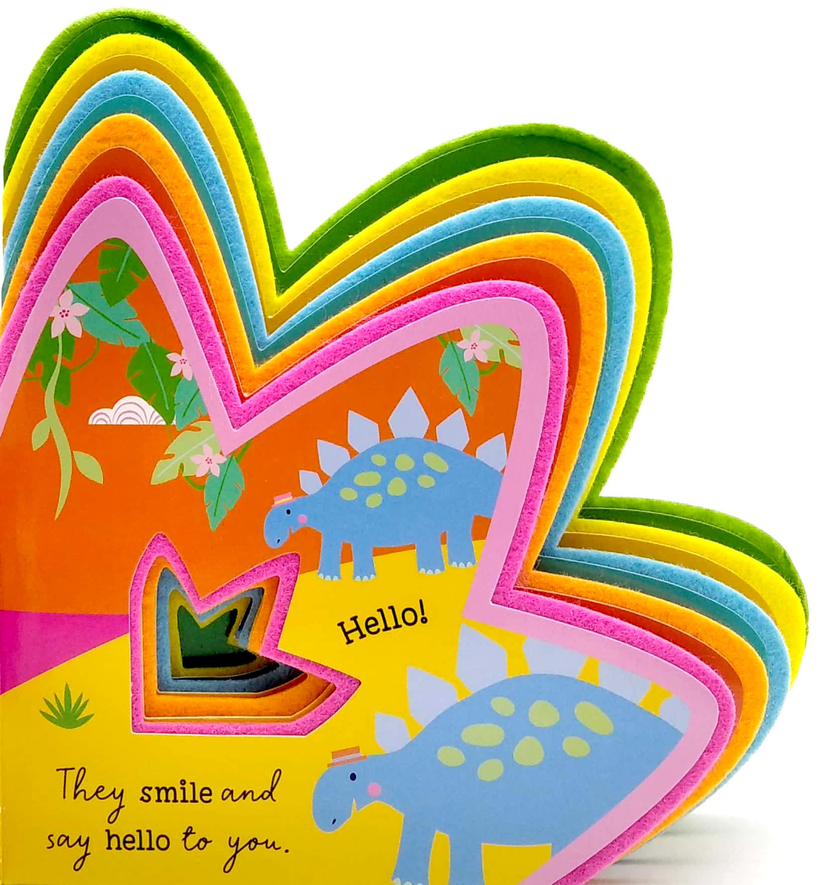 Say hello to the friendly, little dinosaurs and join them in a busy day of play! This sweet book is shaped like a dinosaur footprint, and has layered soft felt pages throughout.