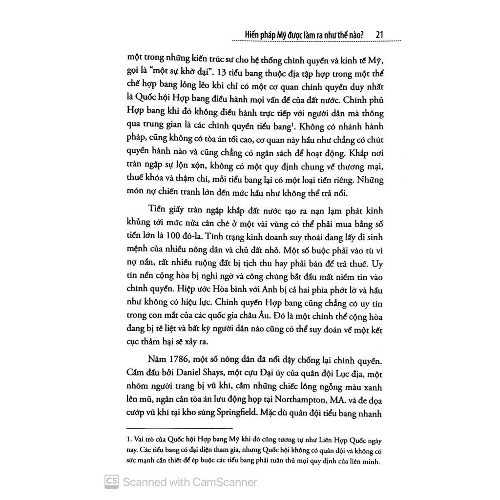 Cuốn sách đã cung cấp một bức tranh toàn cảnh về sự ra đời của Hiến pháp Mỹ, như một lời lý giải cho rất nhiều người có cùng mối băn khoăn. Vậy Hiến pháp Mỹ đã được làm ra như thế nào? Nó được làm ra trong những cuộc tranh luận nảy lửa tưởng như không có lối thoát và những mối bất đồng sâu sắc, bởi những bộ óc vĩ đại có một không hai trong lịch sử, và bằng một tinh thần mà người ta khó có thể tìm một tính từ nào thay thế ngoài cách gọi - “tinh thần Mỹ”. Đó là sự tôn trọng đặc biệt lẫn nhau, thừa nhận những quan điểm hoàn toàn khác biệt, chấp nhận và cùng thỏa hiệp để đi tới lợi ích chung cuối cùng.