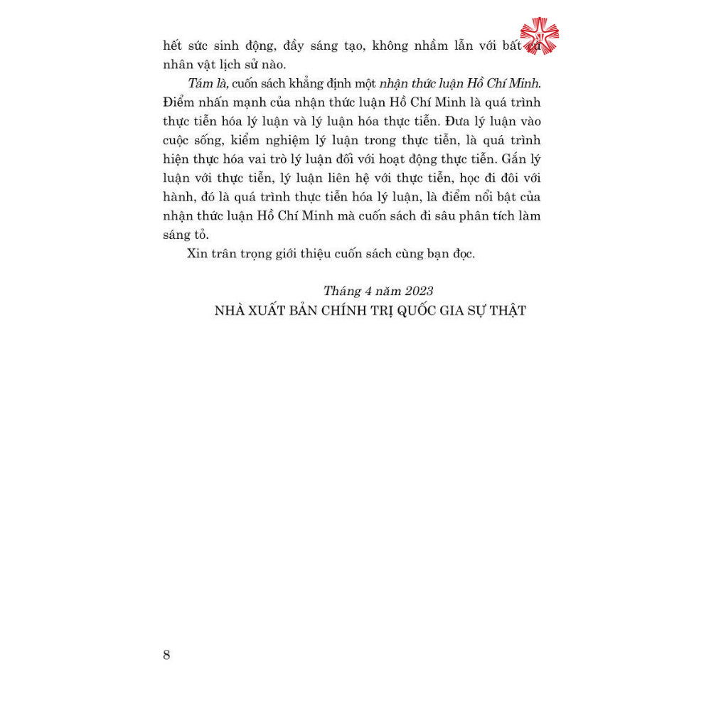 Hệ thống tư tưởng Hồ Chí Minh không chỉ làm nổi bật phép biện chứng được hình thành một cách tự nhiên, sáng tạo từ nhiều nguồn, nhiều hướng, nhiều cơ sở khác nhau mà còn nhấn mạnh nhận thức luận của Người qua quá trình thực tiễn hóa lý luận và lý luận hóa thực tiễn. "Thực tiễn không có lý luận hướng dẫn thì thành thực tiễn mù quáng. Lý luận mà không có liên hệ với thực tiễn là lý luận suông".