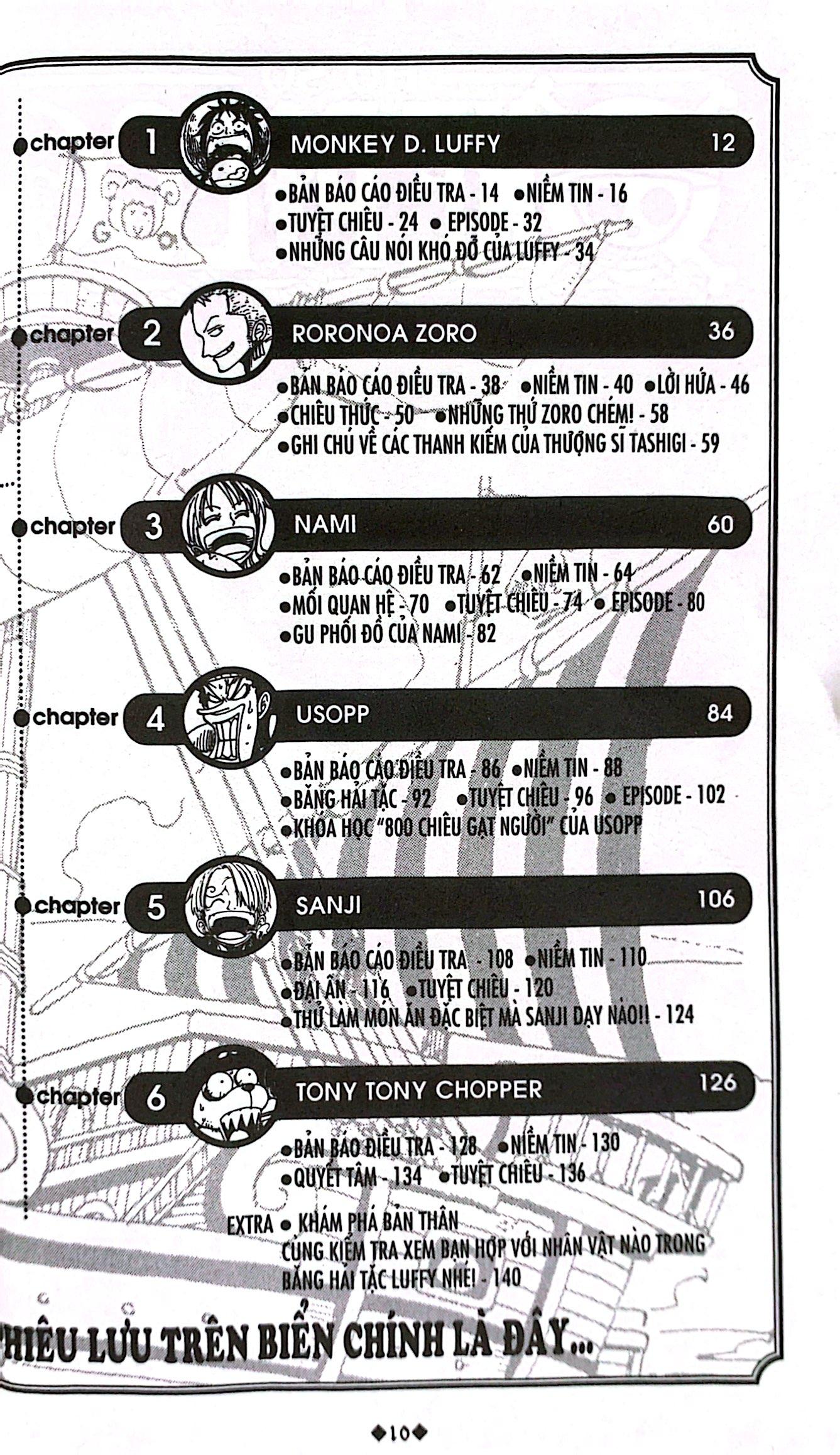•Tùy từng nhân vật mà có thêm những nội dung liên quan tới nhân vật đó như: Những câu nói khó đỡ của Luffy; Gu thời trang của Nami; Thực đơn đặc biệt của Sanji; Giải mã các nấc biến hình của Tony C