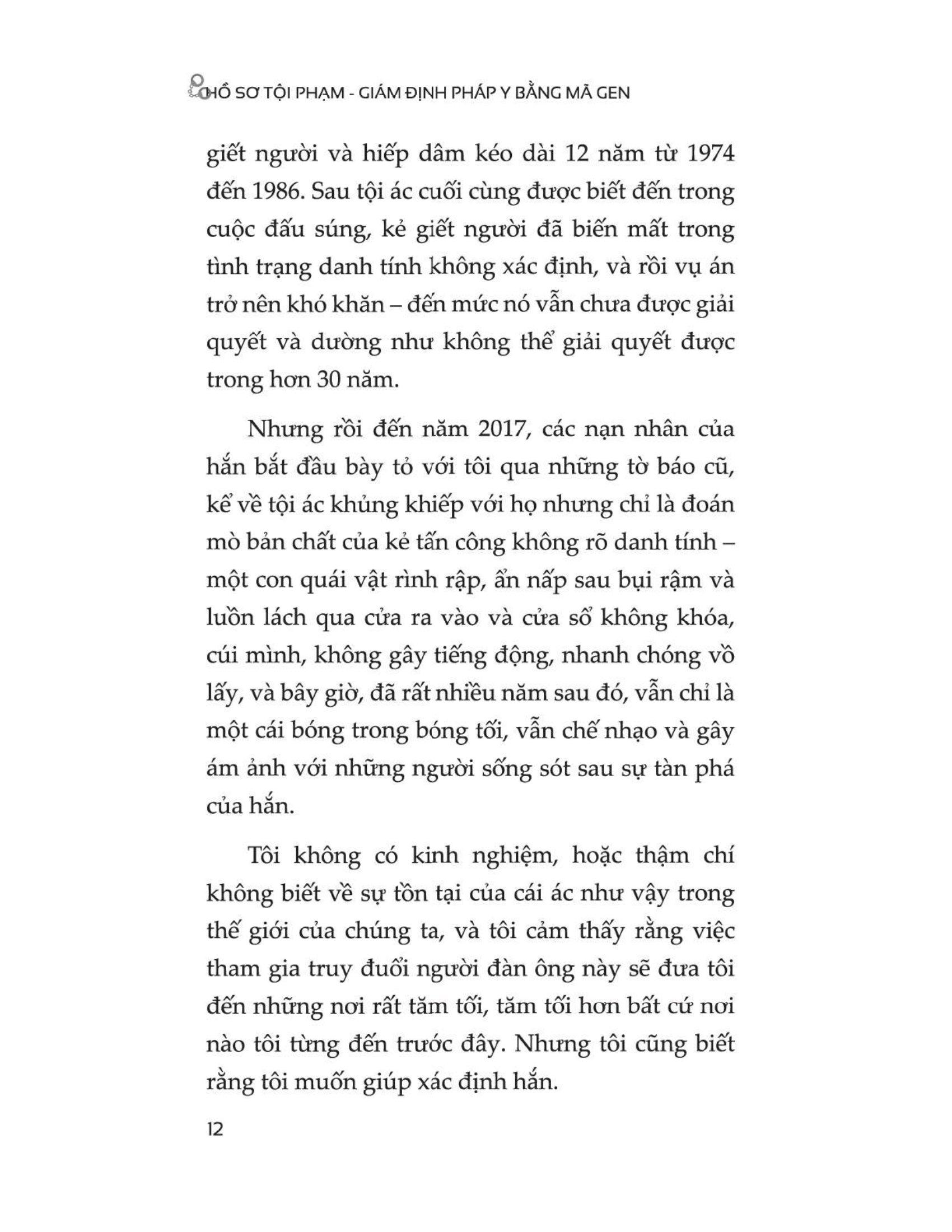 Hồ Sơ Tội Phạm - Giám Định Pháp Y Bằng Mã Gen “Một kiệt tác tội phạm CÓ THẬT được viết bởi một bậc thầy phá án lạnh lùng. Công việc điều tra DNA của Barbara Rae-Venter đã cách mạng hóa cách thức cơ quan thực thi pháp luật săn lùng những kẻ giết người hàng loạt.” Cơ thể bạn được tạo thành từ 30 nghìn tỉ tế bào và bạn thải ra khoảng 500 triệu tế bào mỗi ngày. Trên da đầu của bạn có khoảng 250 nghìn sợi tóc và rụng khoảng 50 đến 100 sợi tóc mỗi ngày. Bạn luôn để dại dấu vết ở bất kỳ nơi nào bạn lướt qua. Và nếu có đủ thời gian, tôi sẽ tìm thấy bạn. Hay nói cách khác, tôi biết rõ bạn là ai. Cuốn sách “HỒ SƠ TỘI PHẠM – GIÁM ĐỊNH PHÁP Y BẰNG MÃ GEN” sẽ dẫn dắt người đọc vào một hành trình sống động qua nhiều vụ án mà chính tác giả đã giải quyết, thường bắt đầu với ít hơn một mẫu DNA.