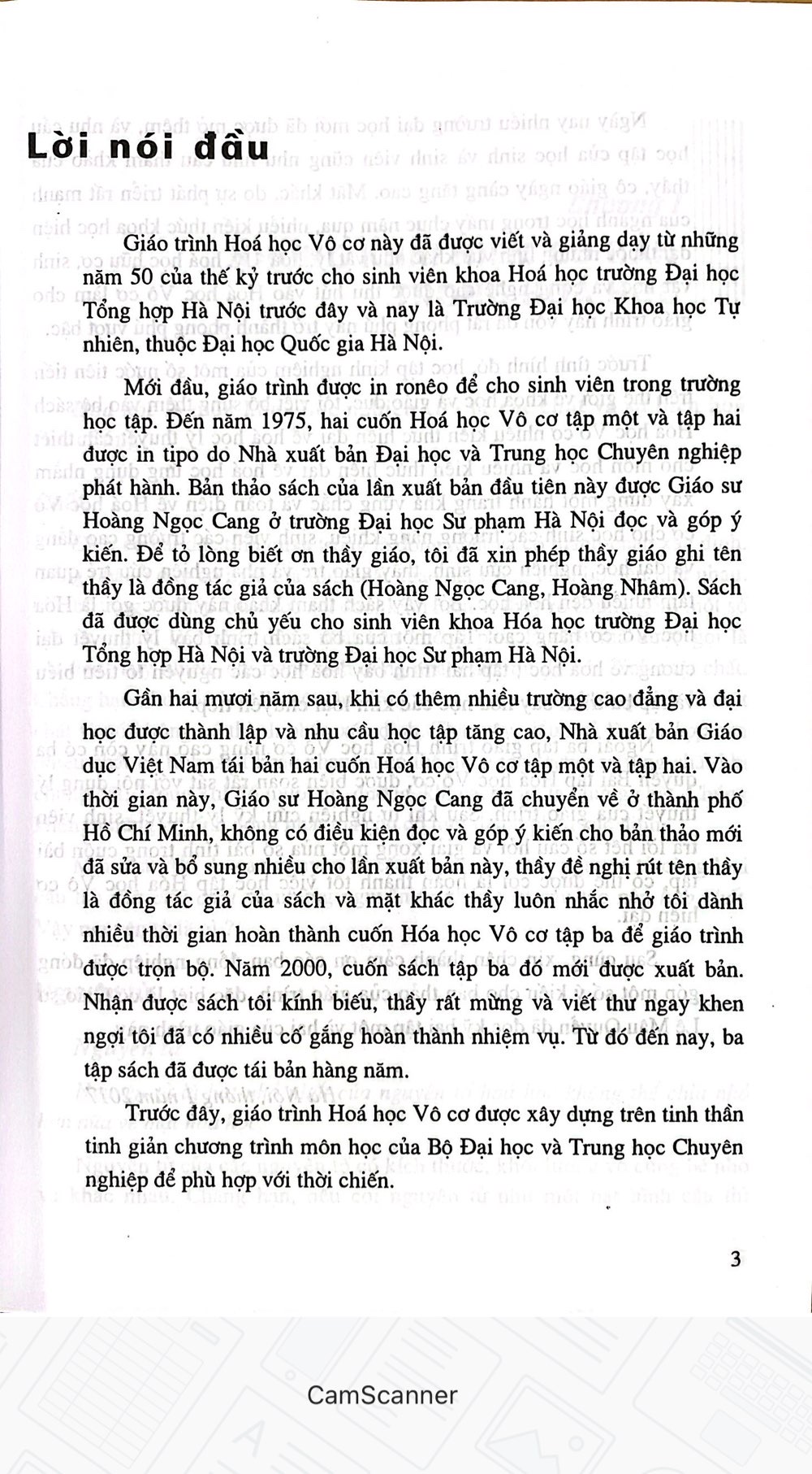 Giáo trình Hoá học Vô cơ này đã được viết và giảng dạy từ những năm 50 của thế kỷ trước cho sinh viên khoa Hoá học trường Đại học Tổng hợp Hà Nội trước
