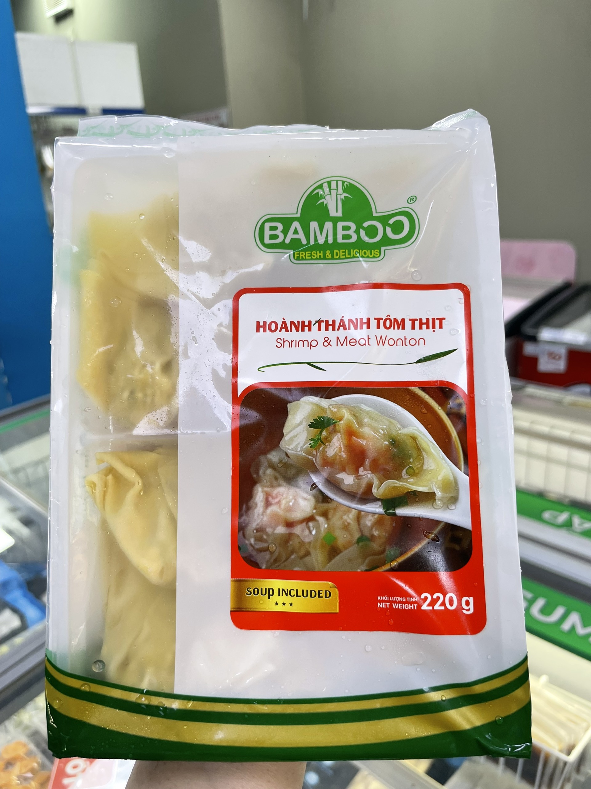 Mua tại TiktokVới sản phẩm tươi sống, trọng lượng thực tế có thể chênh lệch khoảng 10%. ĐỊNH LƯỢNG: 220/gói THÀNH PHẦN: - Hoành thánh: Thịt heo (1948 %), tôm (16.52%), cá, bột mì, nấm đông cô, trứng, tinh bột khoai tây, nước tương, mè trắng, bột năng, muối, tiêu, đường - Nước súp: Nước hầm xương gà, củ cải muối, củ cải trắng, gừng, hành tím, dầu hào, đường, muối, bột ngọt (E621) CÁCH CHẾ BIẾN: Không rã đông. Thêm 150 ml nước + 1 gói soup, nấu sôi. Cho 5 pcs hoành thánh vào nấu sôi vừa trong 3.5-4.5 phút BẢO QUẢN: Ở nhiệt độ -18°C hoặc trong ngăn đá tủ lạnh. Không đông lại sau khi đã rã đông HSD: 12 tháng