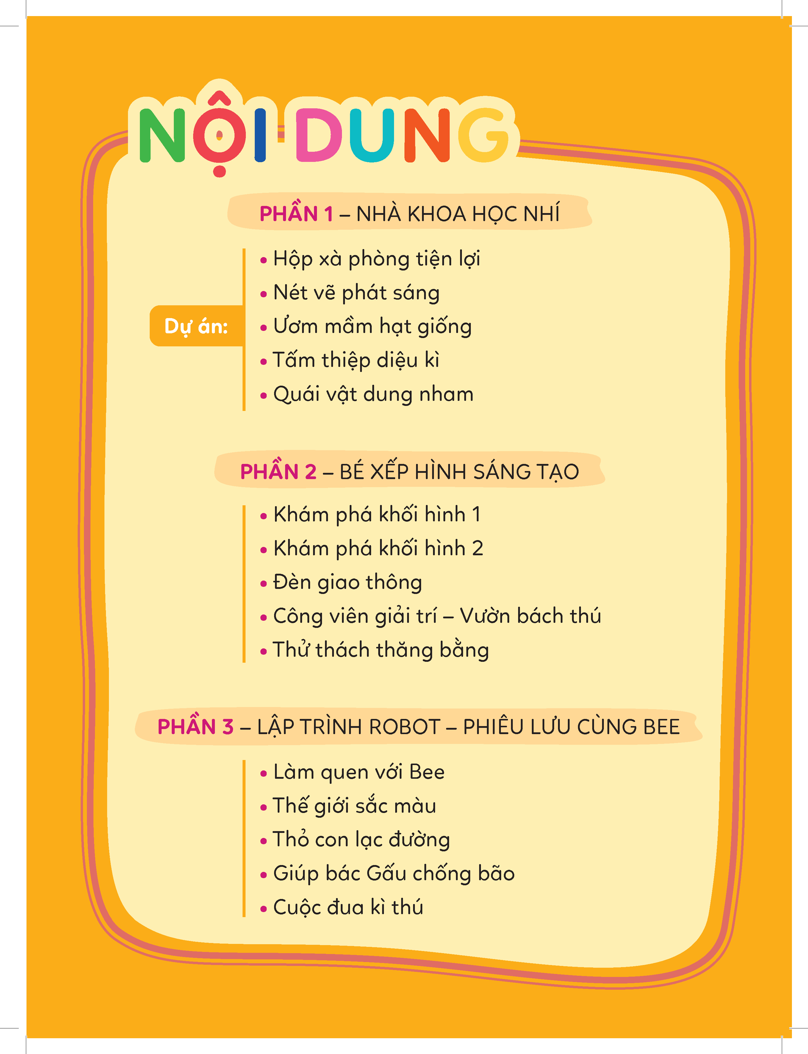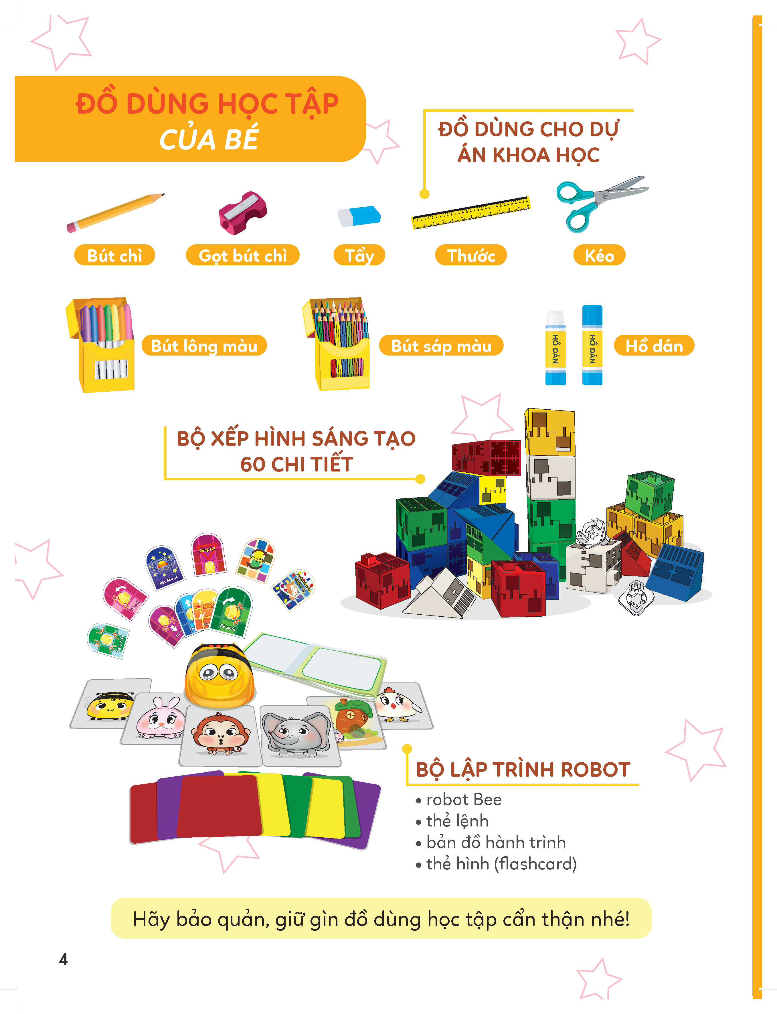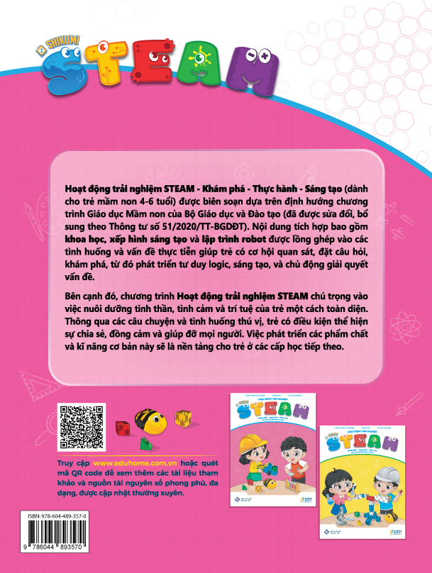Hoạt động trải nghiệm Steam, Khám phá - thực hành - sáng tạo (dành cho trẻ mầm non 4-6 tuổi) được biên soạn dựa trên định hướng chương trình Giáo dục Mầm non của Bộ Giáo dục và Đào tạo (đã được sửa đổi bổ sung theo Thông tư số 51/2020/TT-BGDĐT) các tình huống và vấn đề thực tiễn, nhằm khuyến khích trẻ quan sát, đặt câu hỏi, khám phá, từ đó phát triển tư duy logic, sáng tạo, và chủ động giải quyết vấn đề.   Bên cạnh đó, chương trình Hoạt động trải nghiệm STEAM chú trọng vào việc nuôi dưỡng tinh thần, tình cảm, và trí tuệ của trẻ một cách toàn diện. Thông qua các câu chuyện và tình huống tạo điều kiện cho trẻ thể hiện sự chia sẻ, đồng cảm và giúp đỡ mọi người. Việc phát triển các phẩm chất và kĩ năng cơ bản này sẽ là nền tảng cho trẻ ở các cấp học tiếp theo. Nội dung tài liệu gồm ba phần chính: Dự án Khoa học, Xếp hình Sáng tạo, và Lập trình robot. Mỗi phần đều được thiết kế dựa trên các tình huống và vấn đề thực tiễn, nhằm khuyến khích trẻ quan sát, đặt câu hỏi, khám phá, từ đó phát triển tư duy logic, sáng tạo, và chủ động giải quyết vấn đề. Ngoài ra chương trình Hoạt động trải nghiệm STEAM chú trọng việc phát triển các khía cạnh về thể chất, trí tuệ, thẩm mỹ và đặc biệt là tình cảm của trẻ. Thông qua các câu chuyện và tình huống, trẻ được khuyến khích chia sẻ, đồng cảm, hợp tác và hỗ trợ lẫn nhau, từ đó xây dựng các phẩm chất và năng lực cơ bản quan trọng, chuẩn bị cho hành trang của trẻ cho các cấp học tiếp theo.