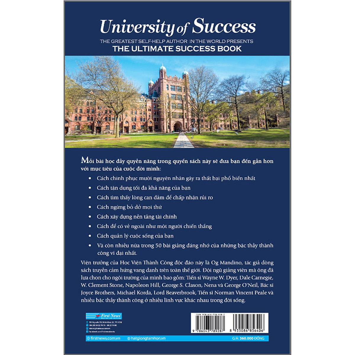 - Giảng đường dạy thành công của 50 bậc trí tuệ sắc sảo, vĩ đại nhất thế giới – UNIVERSITY OF SUCCESS – The Greatest Self-Help Author in the World Presents the Ultimate Success Book Những lời dạy thông thái của các bậc thầy về thành công Bạn có trong tay tất cả mọi thứ được cho là có thể tạo ra một cuộc sống như mơ – kiến thức, kỹ năng, sự sung túc… nhưng chúng có ích gì nếu bạn không biết cách sử dụng? Thành công luôn là đích đến của mỗi người, là niềm khát khao mà ai cũng nỗ lực tìm kiếm. Bạn dành rất nhiều năm ở trường học để tích luỹ kiến thức từ thầy cô, nhưng chẳng có một bài học cụ thể hay công thức cố định nào dạy bạn cách thành công. Chúng ta được dạy rằng phải mơ lớn nhưng chẳng mấy ai biết làm thế nào để bắt đầu biến những giấc mơ thành hiện thực. “Học viện thành công” sẽ giúp bạn làm được điều đó. Og Mandino – tác giả truyền cảm hứng hàng đầu thế giới, cây bút đứng sau những cuốn sách bán chạy nhất, theo New York Times – sẽ thành lập một “học viện” dạy về thành công thông qua cuốn sách này. Sự khác biệt mà Og Mandino tạo ra trong cuốn sách là ông đã tập hợp đội ngũ giảng dạy gồm những con người vĩ đại nhất để dạy về chủ đề thành công và làm thế nào để đạt được nó. “Dale Carnegie, J. Paul Getty, bác sĩ Maxwell Maltz, Napoleon Hill, P. T. Barnum, Norman Vincent Peale, Tiến sĩ Wayne W. Dyer, W. Clement Stone, Dorothea Brande, Richard DeVos, Benjamin Franklin, Lord Beaverbrook, Joyce Brothers – đó chỉ là vài ví dụ trong số năm mươi trí tuệ sắc sảo được tập hợp cùng nhau lần đầu tiên trong lịch sử để thỏa mãn mơ ước của tôi nhiều năm qua – xuất bản một cuốn sách về thành công đỉnh cao mà chỉ những bậc thầy đã được công nhận về chủ đề đó mới được phép cố vấn, giảng dạy và hướng dẫn bạn.” Og Mandino chia sẻ. “Học viện thành công” của Og Mandino được xây dựng như một ngôi trường với chương trình học kéo dài 5 năm, bao gồm 8 học kỳ chính và thêm 2 học kỳ thực tập sau khi tốt nghiệp. Tuy nhiên, bạn không cần tốn tới 5 năm để học chương trình này, bạn chỉ cần đọc hết cuốn sách “Học viện thành công” và áp dụng những triết lý thành công đã được chứng minh hiệu quả bởi những cá nhân vĩ đại nhất. Og Mandino khuyến khích bạn nên đọc một bài mỗi ngày, như vậy, bạn sẽ chỉ mất 50 ngày để hoàn thành chương trình của học viện và sẵn sàng để bước đến thành công. Sau khi xem xét thận trọng, Og Mandino đã sắp xếp các bài học theo thứ tự hợp lí để hỗ trợ bạn trong quá trình chuyển biến dần dần: từ con người của hiện tại trở thành con người mà bạn mong muốn – hạnh phúc, thịnh vượng và thành công. Năm thứ nhất, bạn được hướng dẫn cách định hình bản thân, đọc vị các nguyên nhân dẫn đến thất bại và tận dụng khả năng nắm lấy cơ hội. Năm thứ hai, bạn sẽ biết cách biến suy nghĩ thành hiện thực, và sử dụng sức mạnh để thay đổi cuộc sống. Năm thứ ba, bạn sẽ học được cách loại bỏ các thói quen xấu, thiết lập cách làm việc hiệu quả, gia tăng giá trị bản thân. Năm thứ tư, các giáo sư mang đến những bài giảng về cách làm chủ cuộc đời, sống chung với căng thẳng, tự mang may mắn và cơ hội đến cho bản thân. Năm cuối, sau khi lĩnh hội những công cụ để dẫn đến thành công ở 30 bài giảng trước đó, bạn sẽ học được cách giữ lửa thành công qua các bài học về tận hưởng mọi điều tốt đẹp của cuộc đời, chuẩn bị một tâm hồn đủ đầy và biết cách vực dậy sau thất bại. Phần thưởng lớn nhất học viên nhận được cho những nỗ lực sẽ là nhận thức giúp đổi thay cuộc sống theo hướng tốt đẹp hơn. Hiển nhiên, trong ngôi trường này cũng chẳng có bài kiểm tra đầu vào, tất cả những gì cần chuẩn bị là một khát khao cháy bỏng, một tinh thần học hỏi và sẵn sàng thay đổi. Qua những câu chuyện thú vị, trải nghiệm thực tế, dưới cái nhìn đa chiều, “Học viện thành công” không vẽ vời sự thịnh vượng trên con đường màu hồng rực rỡ mà cung cấp kiến thức thực tế, giúp bạn có thêm kỹ năng, động lực và niềm tin để vượt qua những khuyết điểm của bản thân, tạo dựng thành công cho riêng mình. Bạn đọc nói gì về cuốn sách này “Bất kỳ bạn là ai, đang ở giai đoạn nào của cuộc đời, đều có thể lĩnh hội và kết nối với những bài học có giá trị vượt thời gian trong ‘Học viện thành công’. Những thông tin mà cuốn sách cung cấp có thể được tiếp thu từng chút một mà không khiến chúng ta cảm thấy bị choáng ngợp.” - Độc giả Brian chia sẻ trên Goodreads. “Nếu bạn dành cả đời để tìm kiếm những bậc thầy về truyền động lực, thì đây là cuốn sách dành cho bạn! Những người thầy vĩ đại nhất mọi thời đại đã được tập hợp lại với nhau và dạy cho bạn cách để đạt được thành công.” - Độc gi