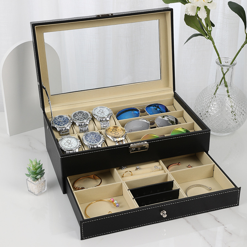 ✨Hộp 2 Tầng Đựng Đồng Hồ, Mắt Kính Và Trang Sức SAIKE SAIKE S633 Vỏ Da Màu Đen