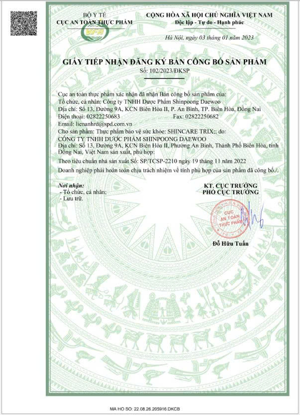 Mua tại TiktokTHỰC PHẨM BẢO VỆ SỨC KHỎE: SHINCARE TRIX THÀNH PHẦN Mỗi viên nén bao phim (780 mg) chứa: Diosmin ...200 mg Chiết xuất hạt Dẻ Ngựa (Horse chestnut Extract) ....100 mg (tương đương Aescin 20 mg) Vitamin C (Acid L-ascorbic) ...100 mg Rutin 50 mg Hesperidin ....50 mg Chiết xuất Bạch Quả (Ginkgo biloba Extract) .30 mg QUY CÁCH ĐÓNG GÓI Hộp 3 vỉ x 10 viên. CÔNG DỤNG Hỗ trợ làm bền thành mạch máu, giảm triệu chứng suy giãn tĩnh mạch do thành mạch kém. ĐỐI TƯỢNG SỬ DỤNG Người lớn bị suy giãn tĩnh mạch do thành mạch kém. CÁCH DÙNG Người lớn: Uống 1 – 2 viên/lần, ngày 2 lần, uống với nước sau khi ăn. BẢO QUẢN Trong bao bì kín, ở nơi khô, tránh ánh sáng trực tiếp, nhiệt độ dưới 30ºC. HSD 36 tháng kể từ ngày sản xuất. LƯU Ý