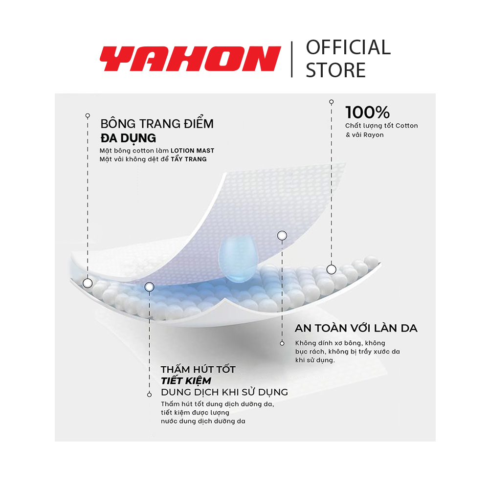Đặc Điểm Nổi Bật: Sản phẩm có thiết kế 2 mặt, với công dụng :Một mặt bằng vải không dệt Rayon phẳng trơn mịn dùng để các sản phẩm dưỡng da, trang điểm.Một mặt bằng vải không dệt Rayon lỗ dùng để tẩy trang, tẩy tế bào chết Bông có kích thước vừa phải , viền ép khá chắc chắn, nên khi sử dụng không bị xơ hay xù lông, không đề lại những sợi lông trên da gây khó chịu Rất phù hớp với khi tẩy trang cho lớp trang điểm dày và đậm HƯỚNG DẪN SỬ DỤNG VÀ BẢO QUẢN: Thấm miếng bông với nước hoa hồng, dung dịch dưỡng da hoặc nước tẩy trang. Nhẹ nhàng vỗ nhẹ lên toàn bộ khuôn mặt. Bảo quản nơi khô ráo, thoáng mát, tránh ánh nắng trực tiếp và nhiệt độ cao. Để xa tầm tay trẻ em. THÔNG TIN THƯƠNG HIỆU: Sản phẩm được sản xuất và phân phối bởi Công ty TNHH YAHON, 100% vốn Đài Loan. Chúng tôi có kinh nghiệm trên 20 năm trong việc sản xuất và kinh doanh các mặt hàng tiêu dùng nhanh bao gồm khăn ướt các loại, bông trang điểm, khăn giấy, quần miễn giặt và vật tư y tế. Với đội ngũ công nhân viên gần1000 người, chúng tôi không ngừng nghiên cứu và sản xuất cho ra các sản phẩm chất lượng cao, đem lại sự thoả mãn cho người dùng khắp Việt Nam và Quốc Tế. Thành phần: Bông Cotton + Vải không dệt Rayon phẳng + Vải không dệt Rayon lỗ Quy cách: 5*6 cm/miếng, 80 miếng/hộp, 48 hộp /thùng Xuất xứ: Việt Nam Ngày sản xuất: xem trên bao bì. HSD: 3 năm kể từ NSX.