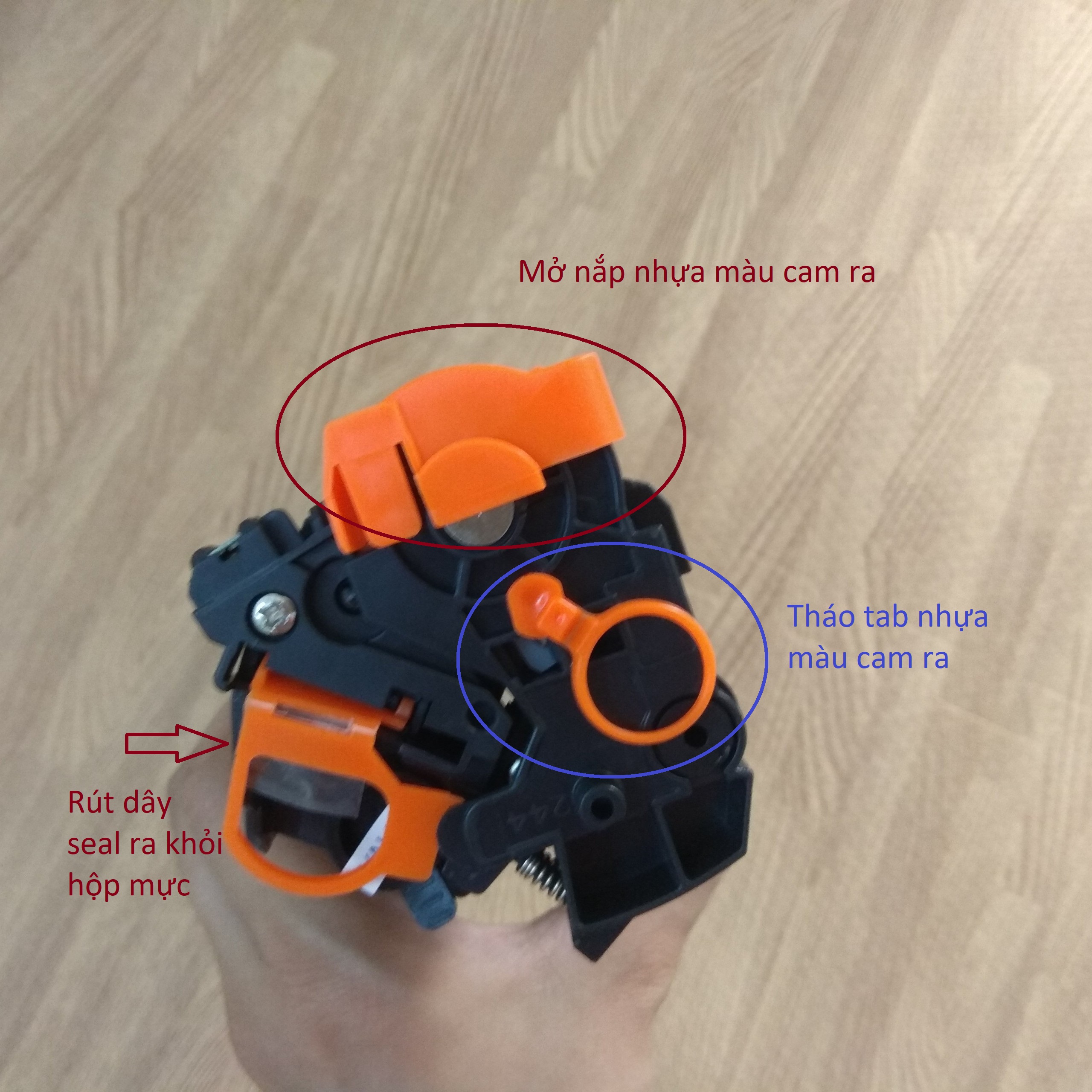 • Tháo tab nhựa màu cam bảo vệ drum ra khỏi.