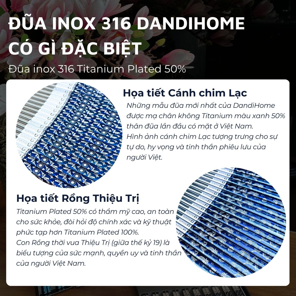 Năm 2023. DandiHome cho ra mắt mẫu đũa inox 316 Titanium Plated - chất liệu inox 316 là inox dùng trong y tế, có độ chống ăn mòn còn tốt hơn so với inox 304.
