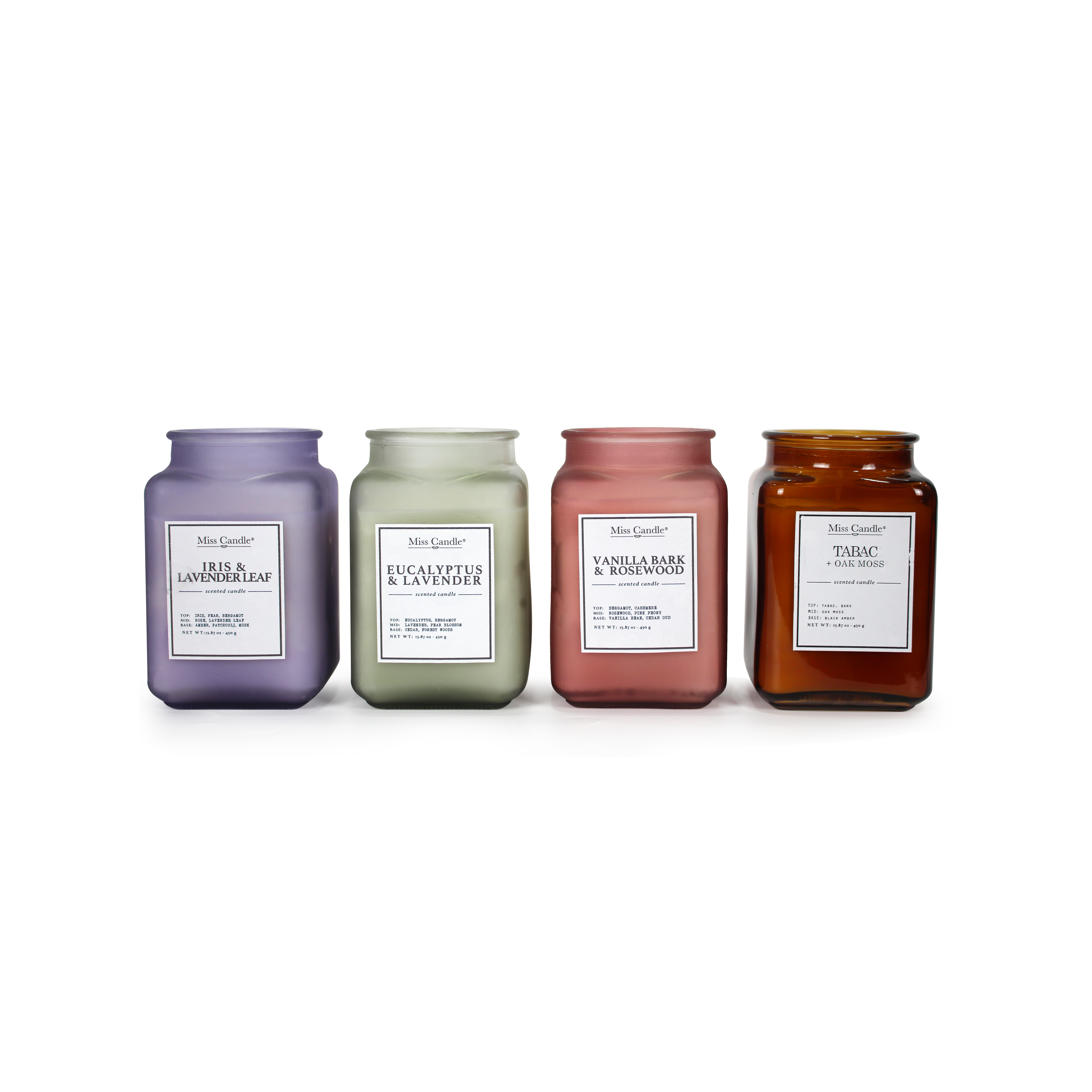 Trọng lượng: 450g Thời gian cháy: 80h Sáp: plam blend Bấc nến: sợi coton 1 tim Màu: xanh oliu, amber, tím, hồng - Công dụng: Trang trí cho không gian trong nhà (phòng bếp, phòng