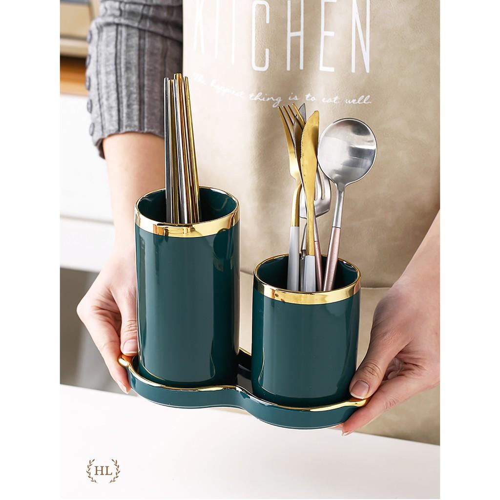 Bộ ống đựng đũa, thìa, muỗng, nĩa Sứ mạ vàng cao cấp sang trọng. Có đĩa hứng nước phong cách Bắc Âu