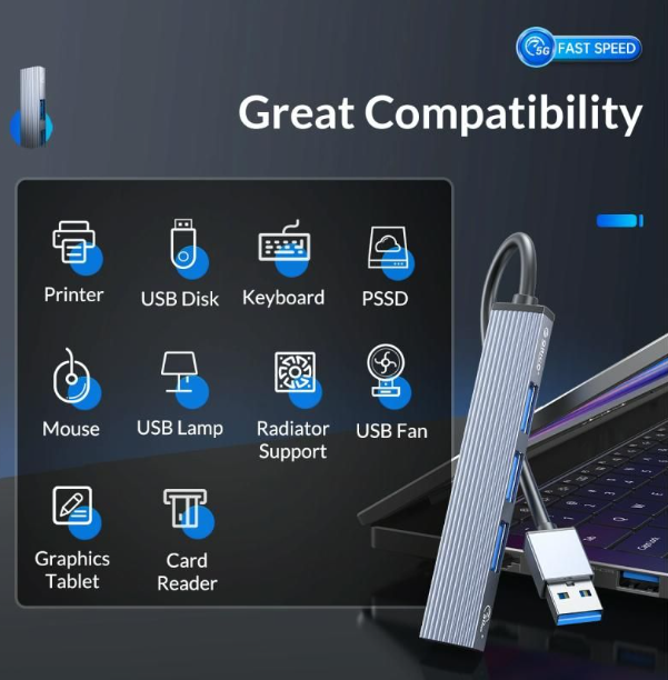 Bộ chia Hub ra 3 cổng USB 3.0 & 2.0 + Đầu đọc thẻ nhớ TF ORICO AH-A12F-GY-BP : - Đầu vào (input): USB 3.0 - Đầu ra (output) : gồm 3 cổng USB (1
