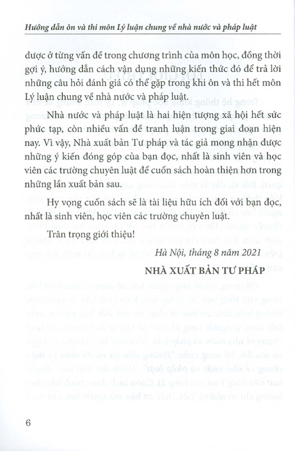 Trong hệ thống khoa học pháp lý, Lý luận chung về nhà nước và pháp luật là khoa học cơ sở, cung cấp lý luận và phương pháp luận cho các nhà khoa học pháp lý chuyên ngành, Vì thế, trong chương trình đào tạo cử nhân luật, Lý luận chung về nhà nước và pháp luật là môn học luật đầu tiên mà hầu hết sinh viên, học viên của các cơ sở đào tạo luật học ở nước ta phải tiếp xúc, làm quen. Bởi vì đây là môn học cung cấp cho người học những kiến thức cơ bản về nhà nước và pháp luật, đặt nền tảng giúp người học có thể tiếp thu được các kiến thức khoa học pháp lý chuyên ngành. Do vậy, muốn học tốt các môn luật khác, sinh viên, học viên chuyên ngành luật cần nắm được những kiến thức cơ bản v ề nhà nước và pháp luật do môn học này cung cấp. Với mong muốn giúp người học dễ dàng và thuận lợi hơn trong việc tổng hợp , hệ thống hóa, khái quát hóa và nắm được những kiến thức cơ bản để phục vụ cho việc học tập các môn chuyên ngành và thi tốt môn Lý luận chung về Nhà nước và Pháp luật, Nhà xuất bản Tư pháp bổ sung cuốn: "Hướng dẫn ôn và thi môn Lý luận chung về Nhà nước và Pháp luật" (Dành cho sinh viên chuyên luật văn bằng 1 và văn bằng 2)
