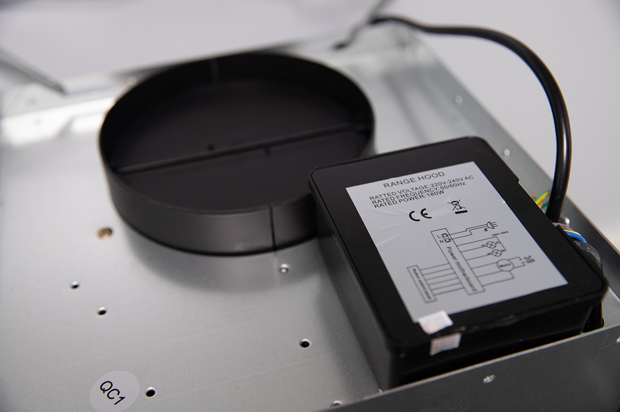Chất liệu Inox-Kính Điều khiển cảm ứng điện tử + Hẹn giờ Màn hình hiển thị LCD Ống thoát Ø 150mm Đèn Led tiết kiệm điện:4x1.5W Bộ lọc than hoạt tính và lưới lọc Inox