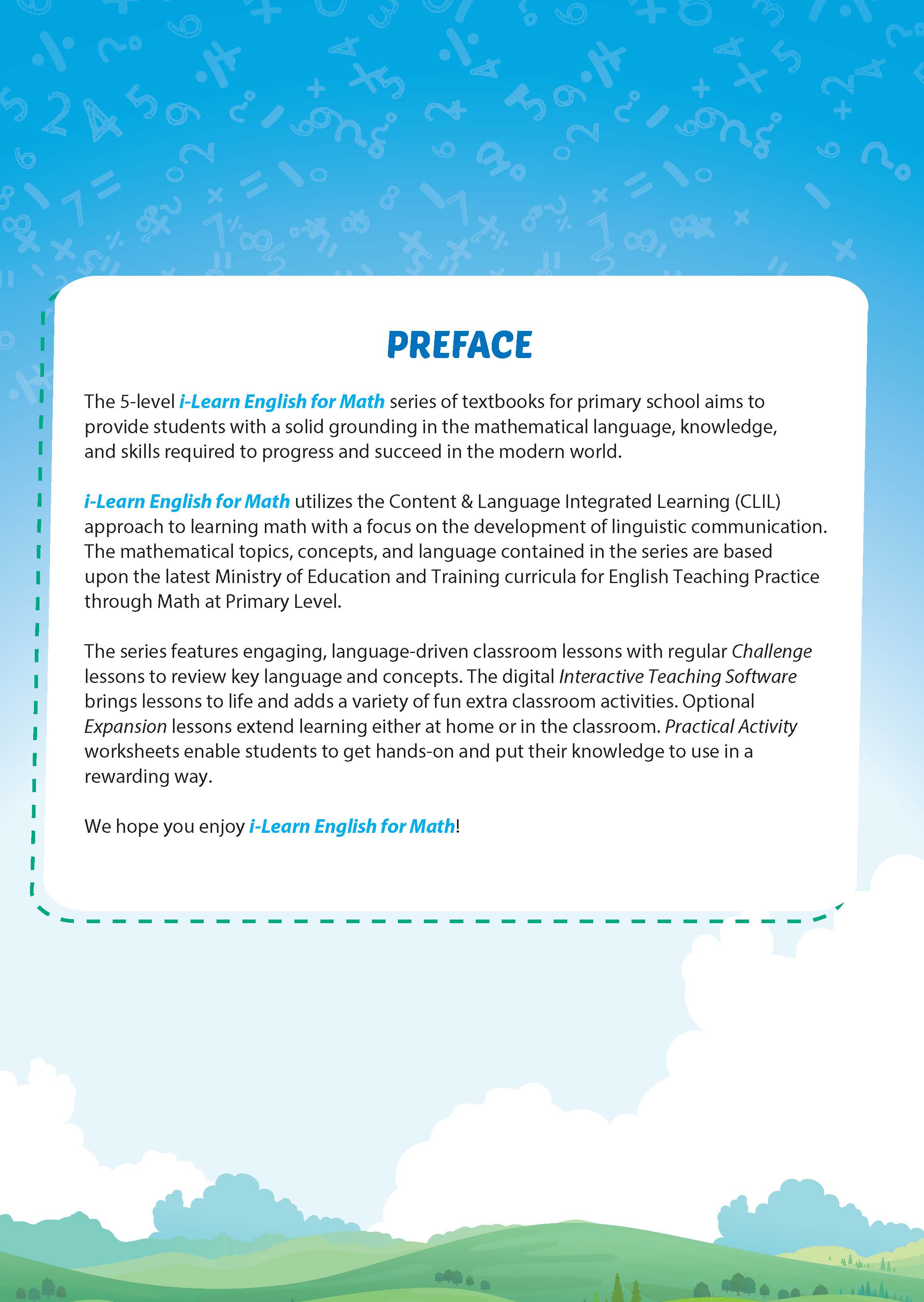 Bộ sách i-Learn English for Math gồm 5 cấp độ dành cho cấp tiểu học nhằm cung cấp cho học sinh nền tảng vững chắc về ngôn ngữ toán học, kiến thức và các kỹ