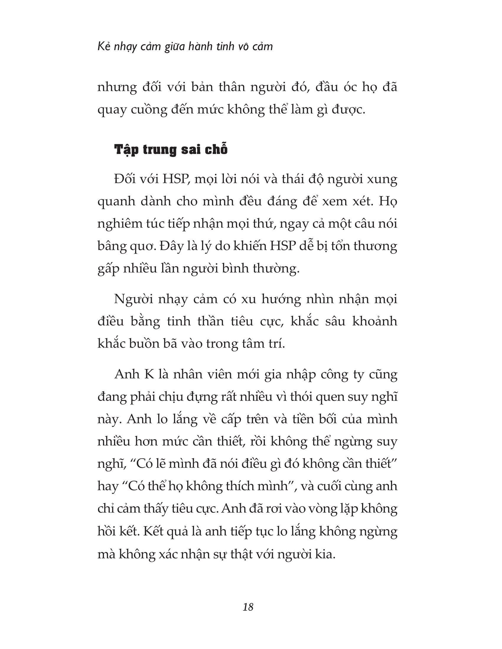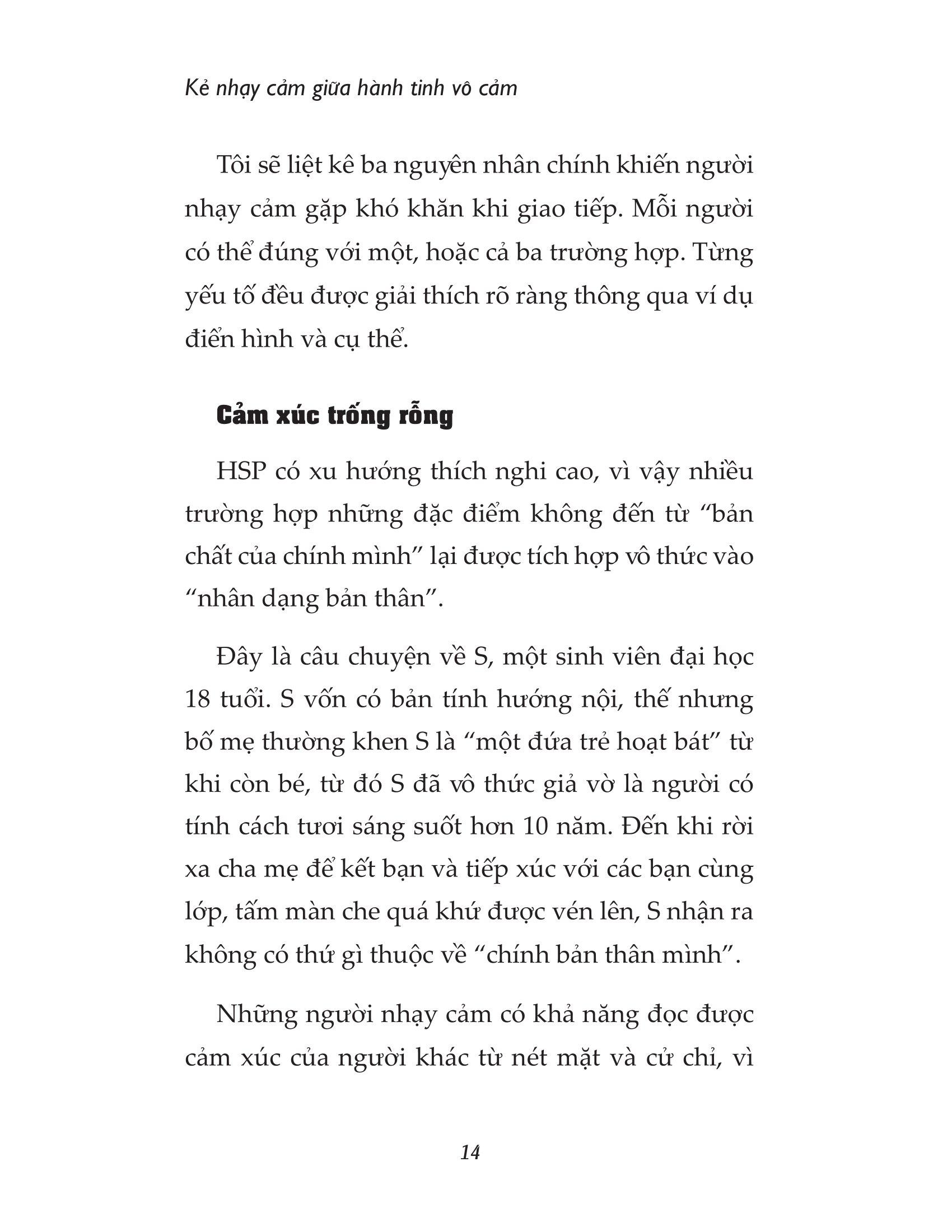 Nếu bạn muốn mở lòng hòa nhập với thế giới bên ngoài, cuốn sách “Kẻ nhạy cảm giữa hành tinh vô cảm” sẽ rất có ích cho bạn. Cuốn sách sẽ đưa ra những lời khuyên trò chuyện hiệu quả để các HSP có thể dễ dàng cất lên tiếng của bản thân, bao gồm cách “lắng nghe thay vì cố gắng ép m.ình nói” hay “phớt lờ những người chỉ biết nói những lời gây tổn thương”. Đặc biệt là lời nhắn “Đừng cố gắng để được mọi người yêu thích”. Đây là cuốn sách dành riêng để hỗ trợ những tâm hồn nhạy cảm, những người có xu hướng tự ti và nghĩ rằng m.ình không có giá trị; thêm yêu bản thân và tự tin vào chính m.ình.