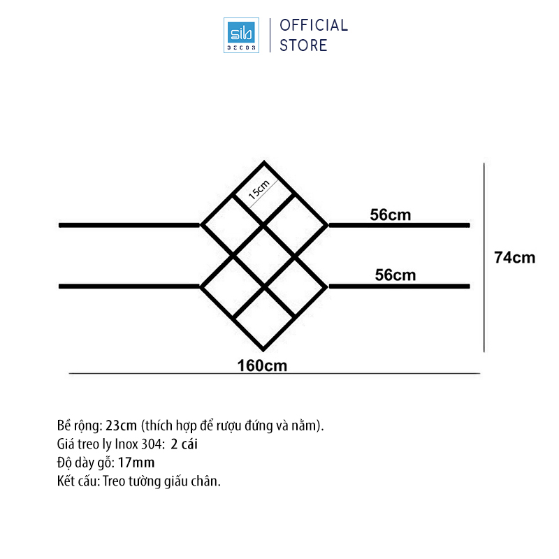 • Kệ để vang có độ sâu của 23cm chủ yếu để các chai vang nhỏ và vừa. Gồm 4 thanh ngang và 1 khối để vang 7 ngăn. Được tặng kèm 02 giá treo ly cao cấp.