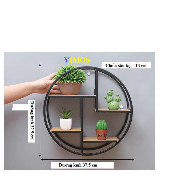 Kích thước kệ : Đường kính 37.5 cm, chiều sâu = 14cm Chất liệu : sắt + gỗ được gia công kĩ , chắc chắn, đạt độ thẩm mỹ cao. Có tặng kèm ốc vít