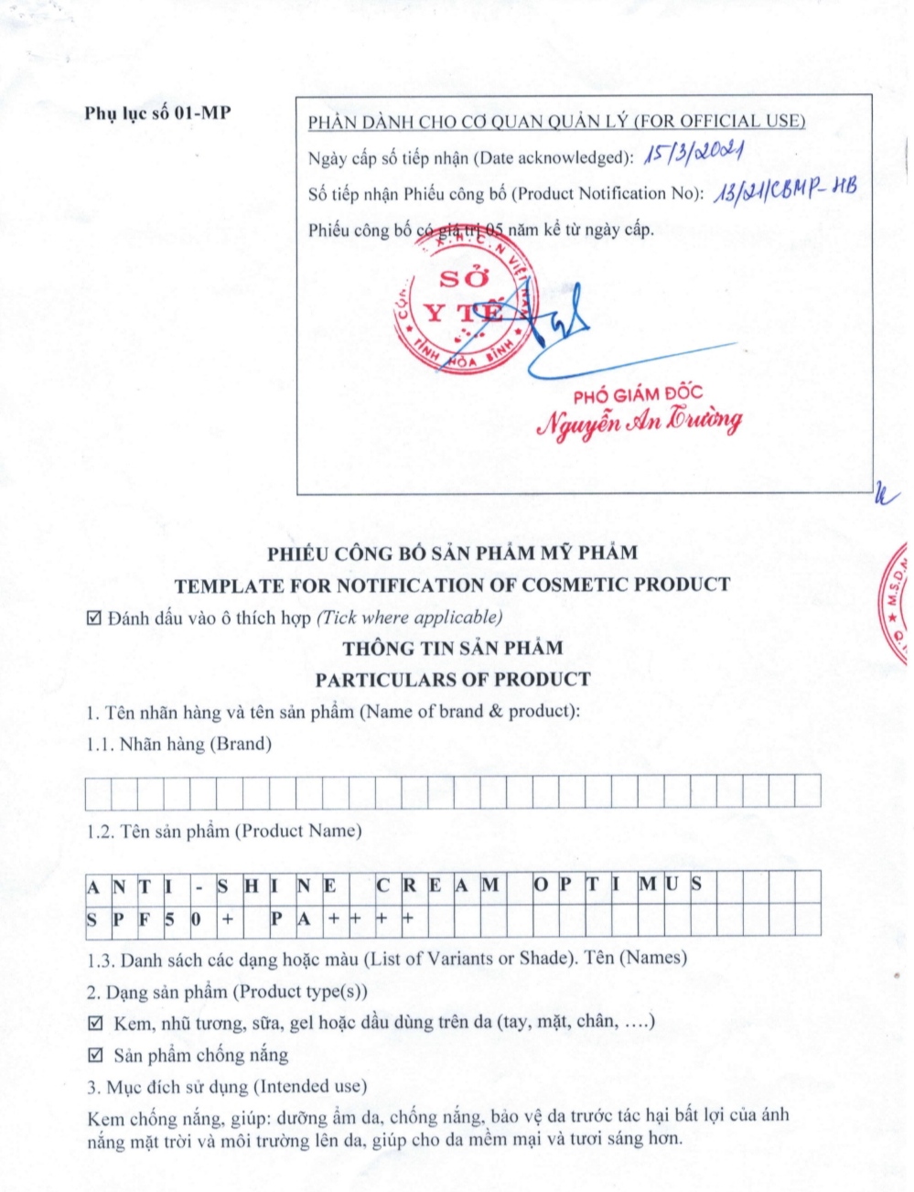 - NSX & HSD : 24 Tháng kể từu ngày sản xuất Kem chống nắng Thanh Mộc Hương 50ml với chỉ số chống nắng tiêu chuẩn SPF 50+ và PA++++ giúp bảo vệ da khỏi tia UVA, UVB và các loại ánh sáng xanh. Ngoài ra, với thành phần từ tảo nâu Pháp, sản phẩm này mang lại công dụng chống lão hóa tuyệt vời. Kem chống nắng THANH MỘC HƯƠNG được sản xuất bởi nhà máy độc quyền đạt chuẩn CGMP-ASEAN. Đây là sản phẩm mang tới những đột phá về chất lượng và chất kem. Với hệ nền Geltrap của Pháp và công nghệ bọc hạt của Hàn sẽ mang lại chất kem mỏng nhẹ, thấm nhanh, không gây bết dính, không trôi, giúp dưỡng ẩm và kiềm dầu hiệu quả. Ngoài ra, với chất kem nâng tone nhẹ nhàng, sản phẩm này giúp thay thế một lớp make up nhẹ nhàng, rút ngắn các bước trang điểm, chỉ thêm một chút son là đủ tươi tắn khi ra ngoài trời. KEM CHỐNG NẮNG THANH MỘC HƯƠNG SPF50+ VÀ PA++++ 50ML Công dụng Kem chống nắng Optimus Thanh Mộc Hương