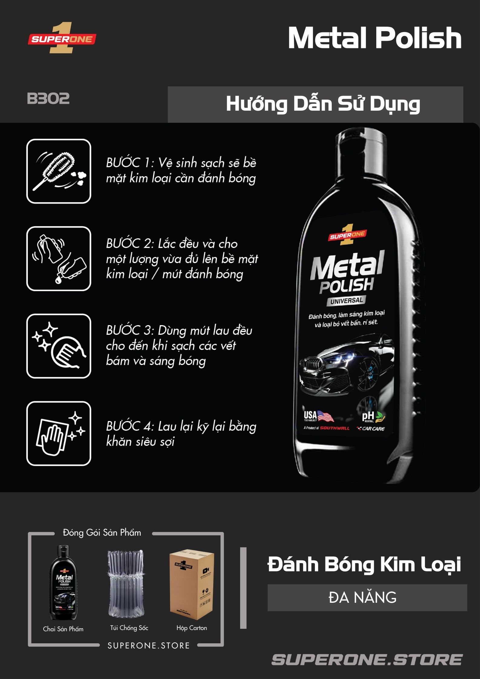 LÀM SẠCH, SÁNG BÓNG, CHỐNG RỈ SÉT KIM LOẠI Kem   Đánh Bóng Kim Loại Super One Metal Polish là một sản phẩm không thể thiếu   trong việc chăm sóc ô tô của bạn. Với khả năng làm sáng bóng các bề mặt kim   loại như lưới tản nhiệt, mâm vành, ốp trang trí, sản phẩm này nhanh chóng và   dễ dàng loại bỏ hiện tượng oxy hóa, vết rỉ sét, trầy xước nhỏ và các vết ố   khó chịu khác. Đặc biệt, sản phẩm không chứa axit an toàn cho tất cả các loại   bề mặt kim loại, bao gồm chrome, nhôm, đồng và thép không rỉ. Sản phẩm này   không chỉ làm sạch và đánh bóng mà còn đảm bảo không gây trầy xước, để lại lớp   bóng như gương. Công thức đặc biệt chứa các chất ức chế ăn mòn giúp ngăn ngừa   sự hình thành lại rỉ sét. Sử dụng dễ dàng và hiệu quả, giúp duy trì sự rạng   ngời của ô tô bạn trong thời gian dài.   Đặc Tính Sản Phẩm