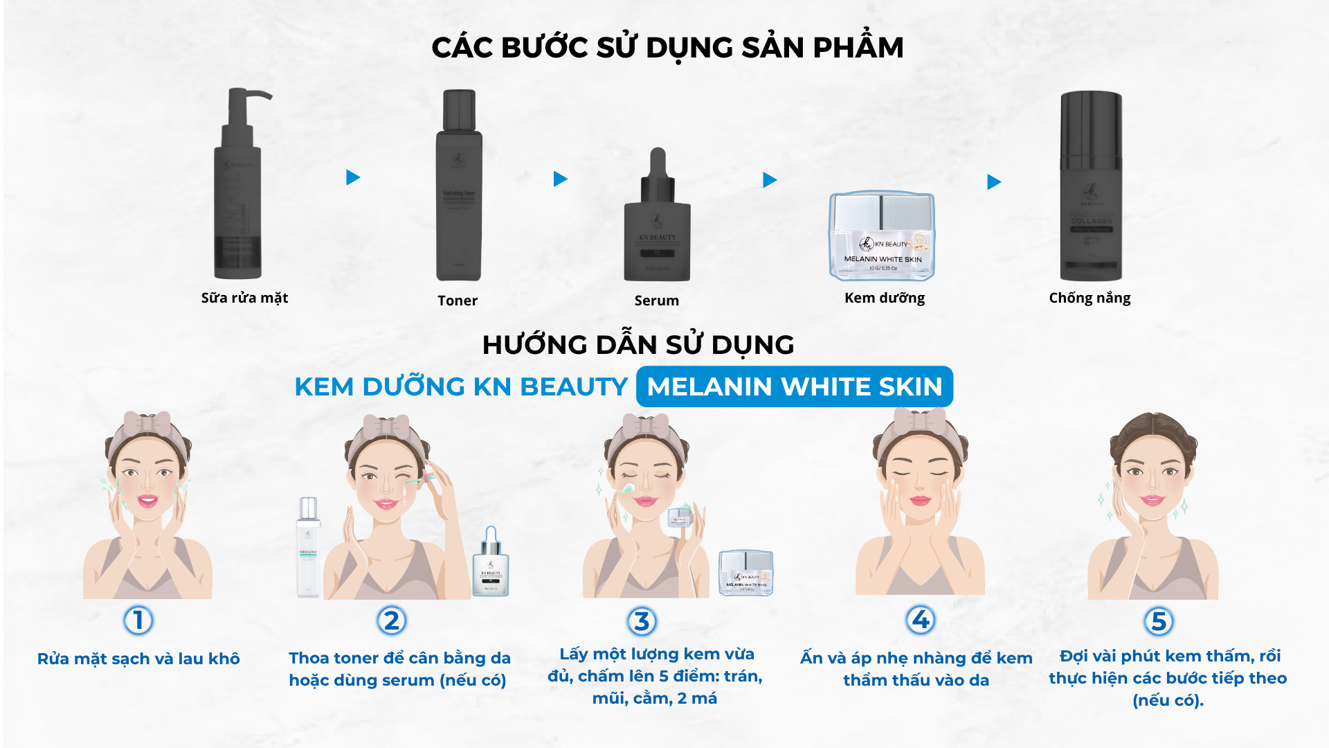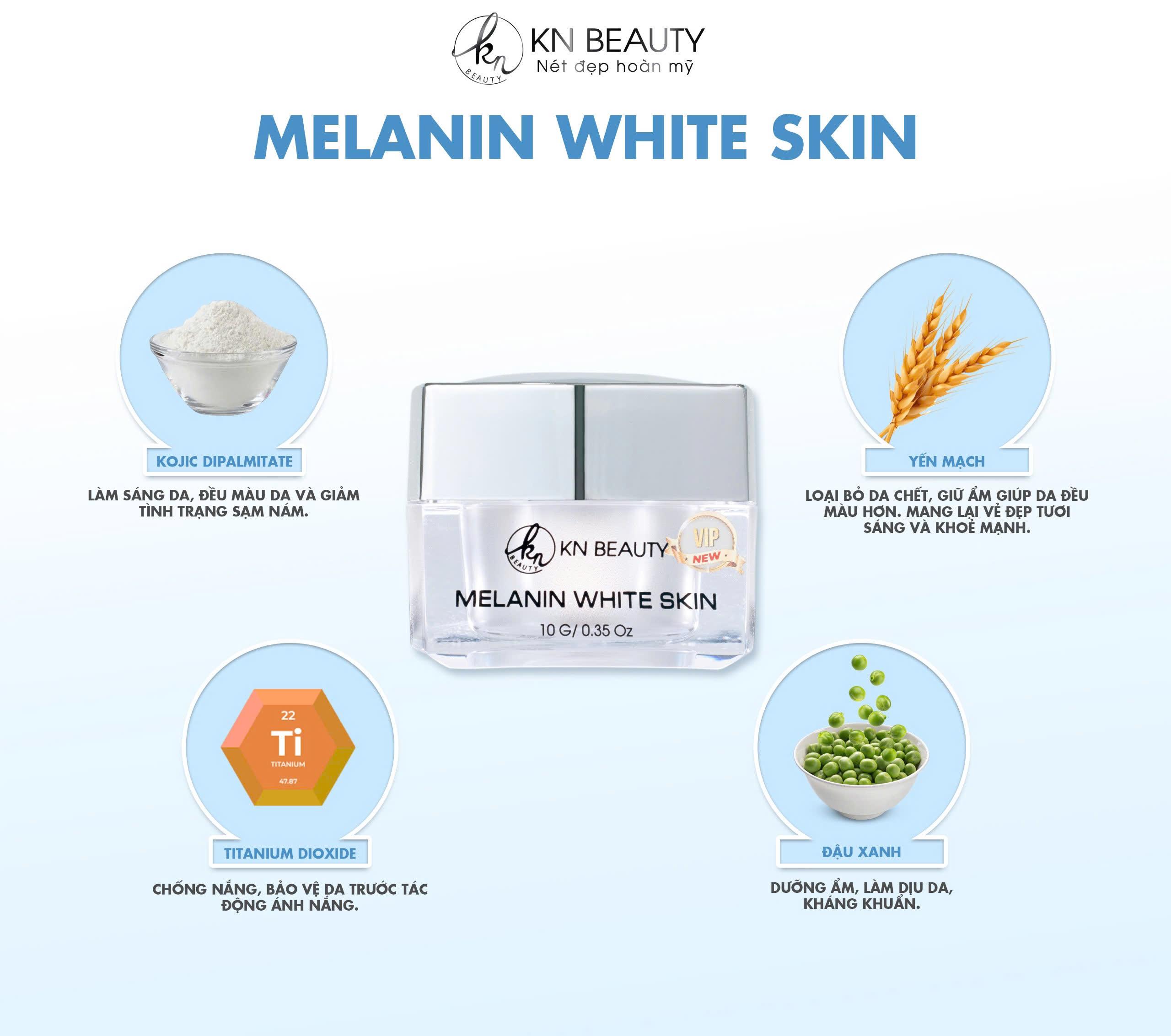 Kem Dưỡng Da MELANIN WHITE SKIN KN Beauty 10G là sản phẩm chăm sóc da giúp nuôi dưỡng làn da sáng hồng hào, mịn màng.