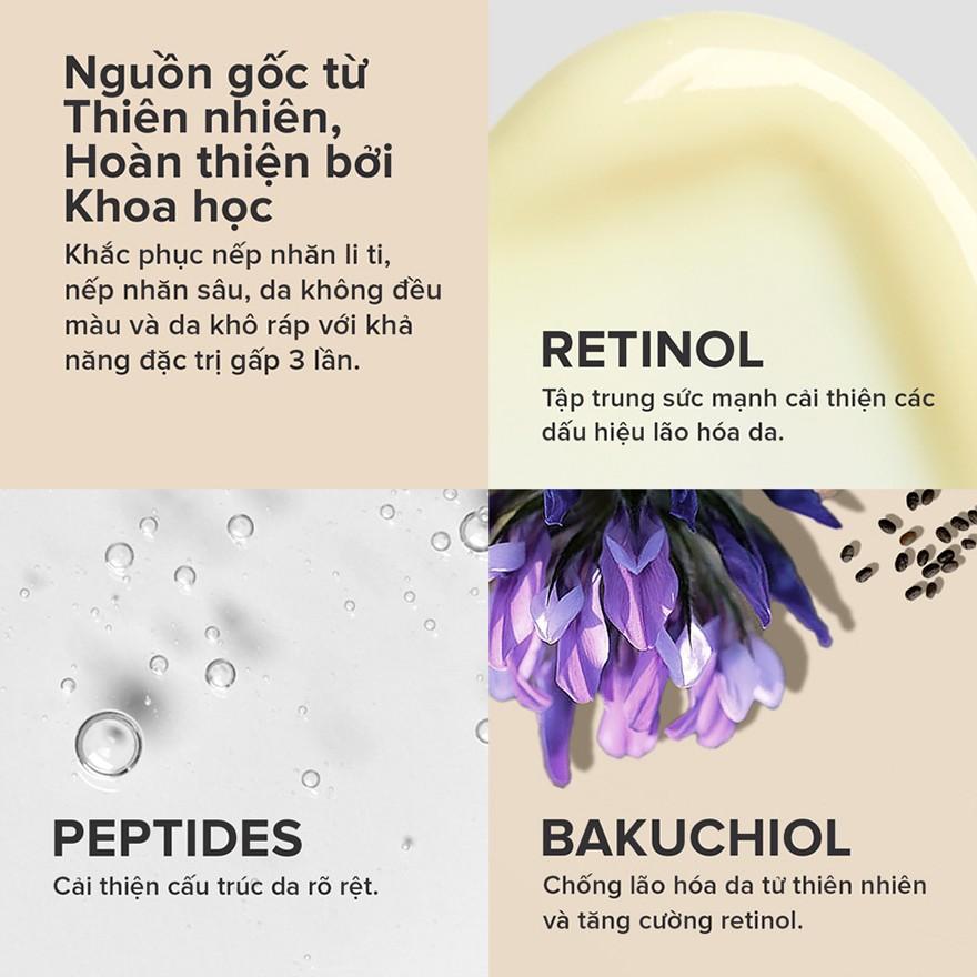• Retinol tập trung sức mạnh cải thiện dấu hiệu lã&.,&o hoá&.,& da. - &.,&Bakuchiol &.,&chứa cá&.,&c chất hỗ trợ kí&.,&ch thí&.,&ch tá&.,&i tạo tế bà&.,&o, tăng cường sản sinh collagen, chống oxy hó&.,&a, được chiết xuất từ tự nhiê&.,&n nê&.,&n khô&.,&ng gâ&.,&y kí&.,&ch ứng cho những là&.,&n da nhạy cảm. - &.,&Peptide giú&.,&p giảm thiểu sự nhạy cảm và&.,& ửng đỏ trê&.,&n da.