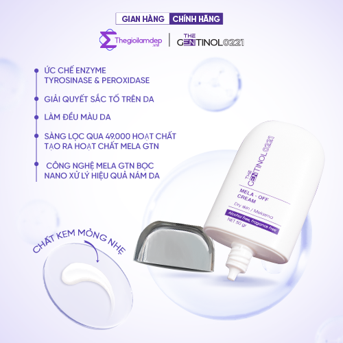 ƯU ĐIỂM NỔI BẬT Không cồn Không hương liệu Không paraben - Công nghệ Mela GTN bọc nano, có khả năng tác động nhiều con đường hình thành sắc tố, xử lý hiệu quả nám da - Sàng lọc qua hơn 49.000 hợp chất, các chuyên gia tại Hàn Quốc đã tạo nên bước tiến mới trong ngành dược mỹ phẩm với hoạt chất đột phá mang tên MELA OFF CREAM