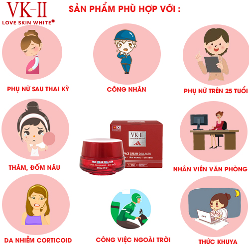 Thành phần: Vaseline, Paraffinum Liquidum, Isopropyl Myristate, Beewax, Talc, Titanium Dioxide (7,0% ), Niacinamide, Tocopheryl Acetate, Hydrolyzed Collagen, Boric Acid (0,8%), Salicylic Acid (0,5%), Parfum, DMDM Hydantoin (0,1%), CI 15985. Công dụng :   - Làm giảm và ngăn ngừa các vết thâm nám và tàn nhang lâu năm dưới da   - Ngăn ngừa sự hình thành melanin, hình thành các vết nám, tàn nhang.  - Giúp se khít lỗ chân lông, làm da mặt trở nên mềm mịn và bóng láng hơn  -  Dưỡng da, giúp da trở nên trắng sáng và đều màu hơn  - Giảm các loại mụn trên da, giúp da phục hồi các hư tổn do mụn để lại  - Làm sạch các lớp sần sùi, giúp giảm nếp nhăn và giúp da chống lại sự lão hóa. *Cách sử dụng :   - Sử dùng ngày 2 lần sáng và tối sau khi rửa sạch mặt  - Dùng lượng kem vừa đủ và chia đều 5 điểm: trán, mũi, cằm và 2 má. Sau đó thoa đều nhẹ nhàng hướng từ dưới lên, massage đều và vỗ nhẹ để kem thẩm thấu hoàn toàn vào da.
