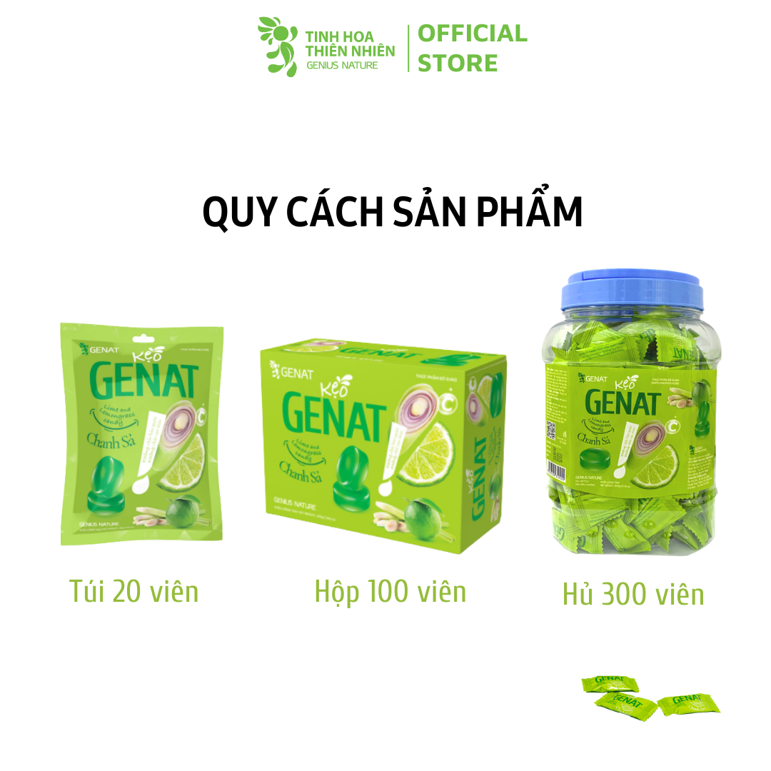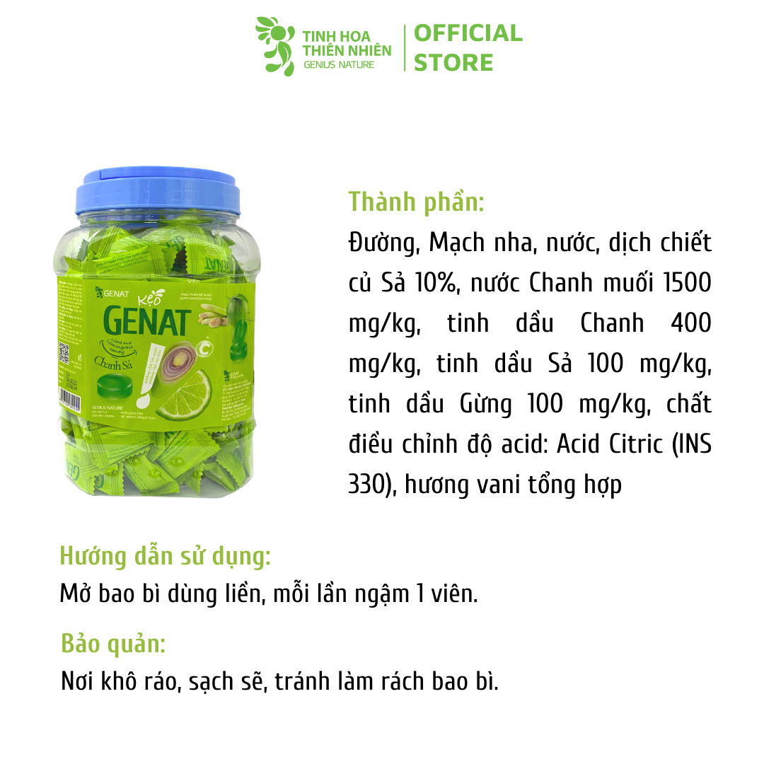 Kẹo ngậm Chanh Sả (Hủ 300 viên) - Genat -Tinh Hoa Thiên Nhiên Thành phần: Đường, Mạch nha, nước, dịch chiết củ Sả 10%, nước Chanh muối 1500 mg/kg, tinh dầu Chanh 400 mg/kg, tinh