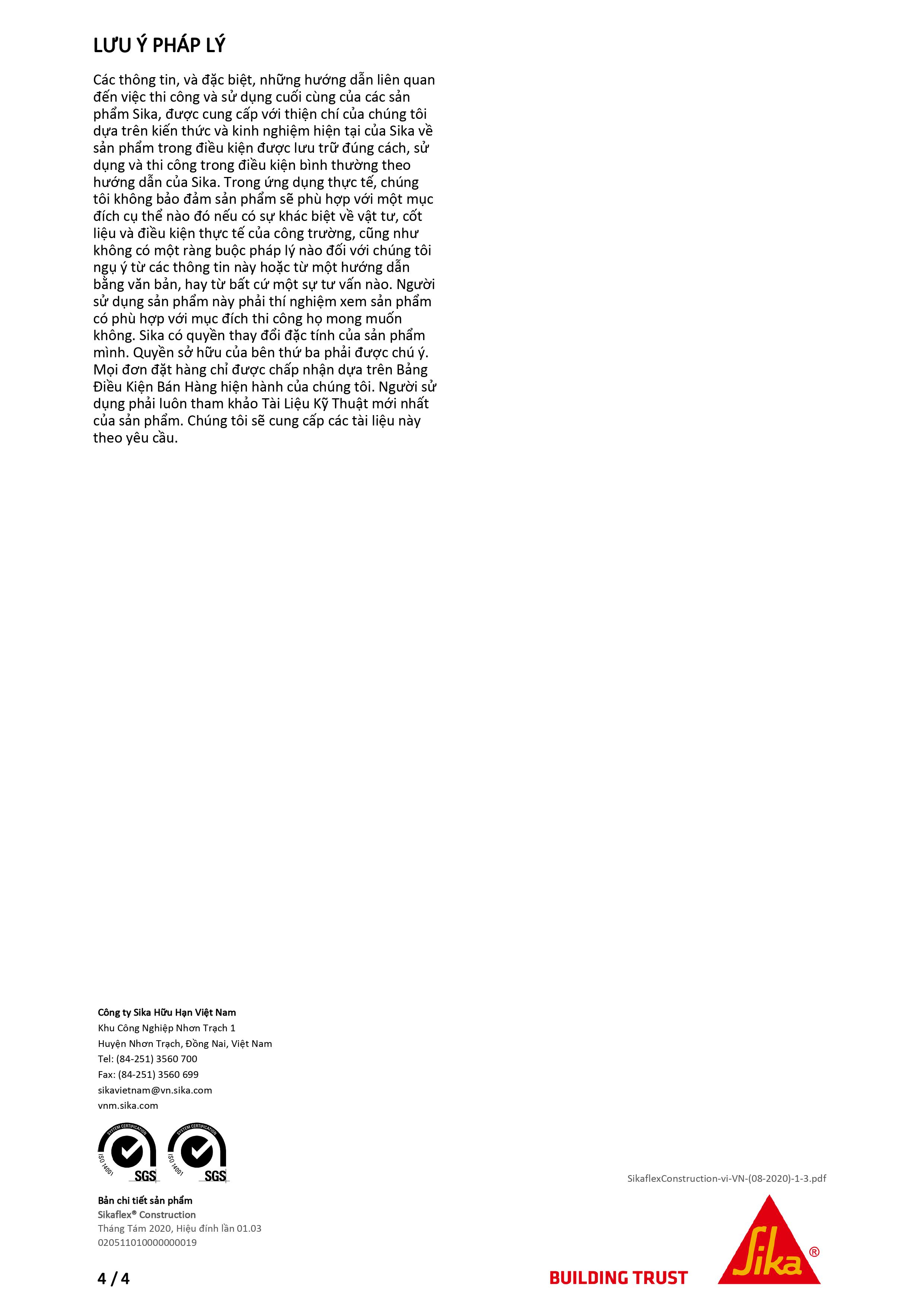 Sikaflex-140 Construction - Keo trám khe xây dựng chuyên dụng (sản phẩm thay thế cho Sikaflex Construction)  1. MÔ TẢSikaflex-140 Construction đóng rắn với hơi ẩm, keo trám khe mềm.2. ỨNG DỤNGỨn...