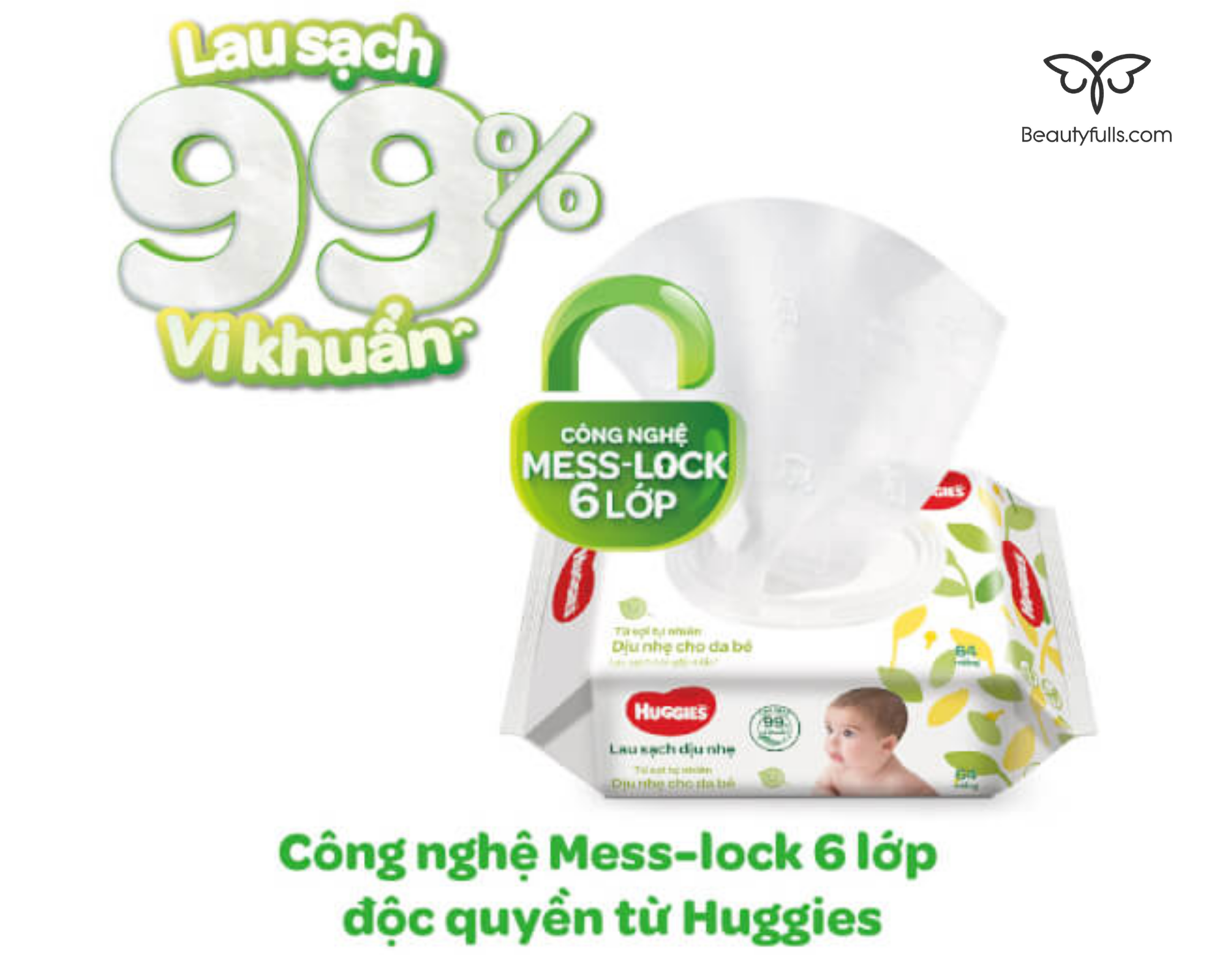 - Công nghệ Mess-lock 6 lớp độc quyền từ Huggies với sợi giấy tự nhiên siêu thấm giúp hút sạch, khoá chặt và loại bỏ đến 99% vi khuẩn. Sản phẩm dễ dàng lau sạch trong 1 lần những vết bẩn từ mặt, tay và mông của bé.