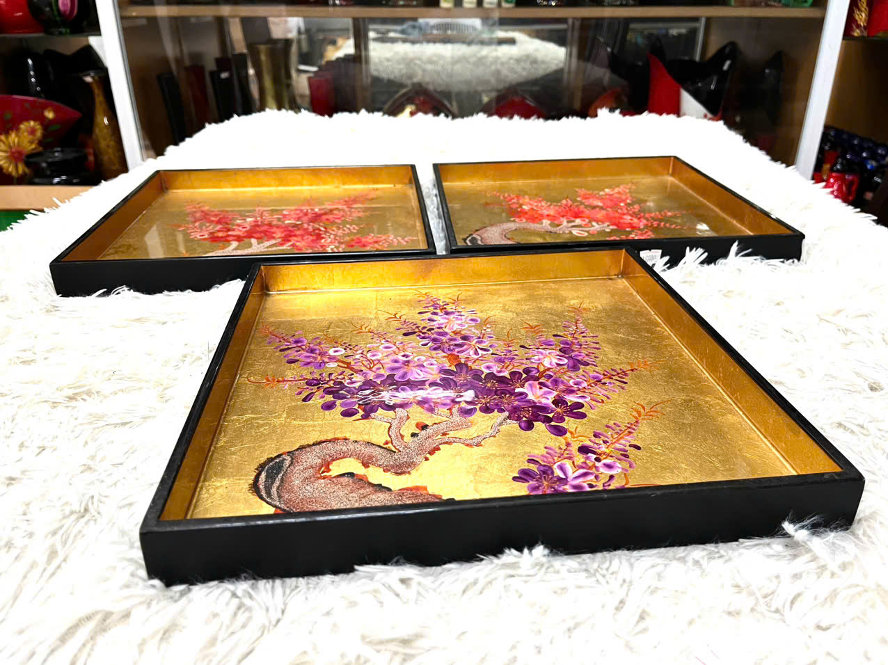 Khay được làm từ chất liệu gỗ tự nhiên sơn mài vẽ tỉ mỉ, độc đáo, họa tiết phong phú