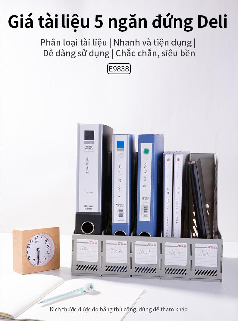 Khay Tài Liệu 5 Ngăn Đứng Deli - 9838 được thiết kế ngăn lớn riêng biệt với khổ A4 thông dụng, có thể đựng được nhiều tài liệu khác nhau, giúp bạn có một nơi