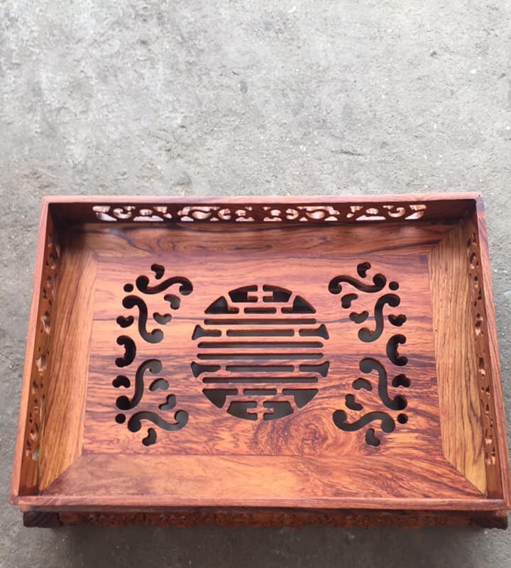 _ Khay đựng trà được thiết kế theo hình chữ nhật ,thân và dạ khay được điêu khắc trạm trổ tỉ mỉ ,tinh sảo kỳ công .Đi hều hết tất cả mọi chi tiết góc ngách nội dung hoa văn của khay trà ,đều được gọt tỉa chỉnh sắc nét hoàn toàn bằng tay thủ công .Đồng thời khay trà được kiểm định kỹ lưỡng khắt khe ư cho vào thẩm sấy cho gỗ khô kiệt .Mục đích trống dập nứt vênh mo mối mọt .Kết hợp với trà nhám , Đánh giấy giáp nhiều nước ,cho sạch sẽ sờ mát lạnh .Song cho vào phun lót làm bóng mờ để giữ lại mầu sắc vân gỗ tự nhiên .Khay trà được làm và hoàn thiện do bàn tay khối óc tài hoa ,Từ những người thợ dầy rặn kinh nghiệm , Trong làng nghề truyền thống .Chính vì thế khay trà đựng ấm nước đã đáp ứng đầy đủ mọi tiêu trí cần thiết như ( Đẹp bền rẻ ) Thẩm mỹ nghệ thuật với chất lượng tuyệt vời