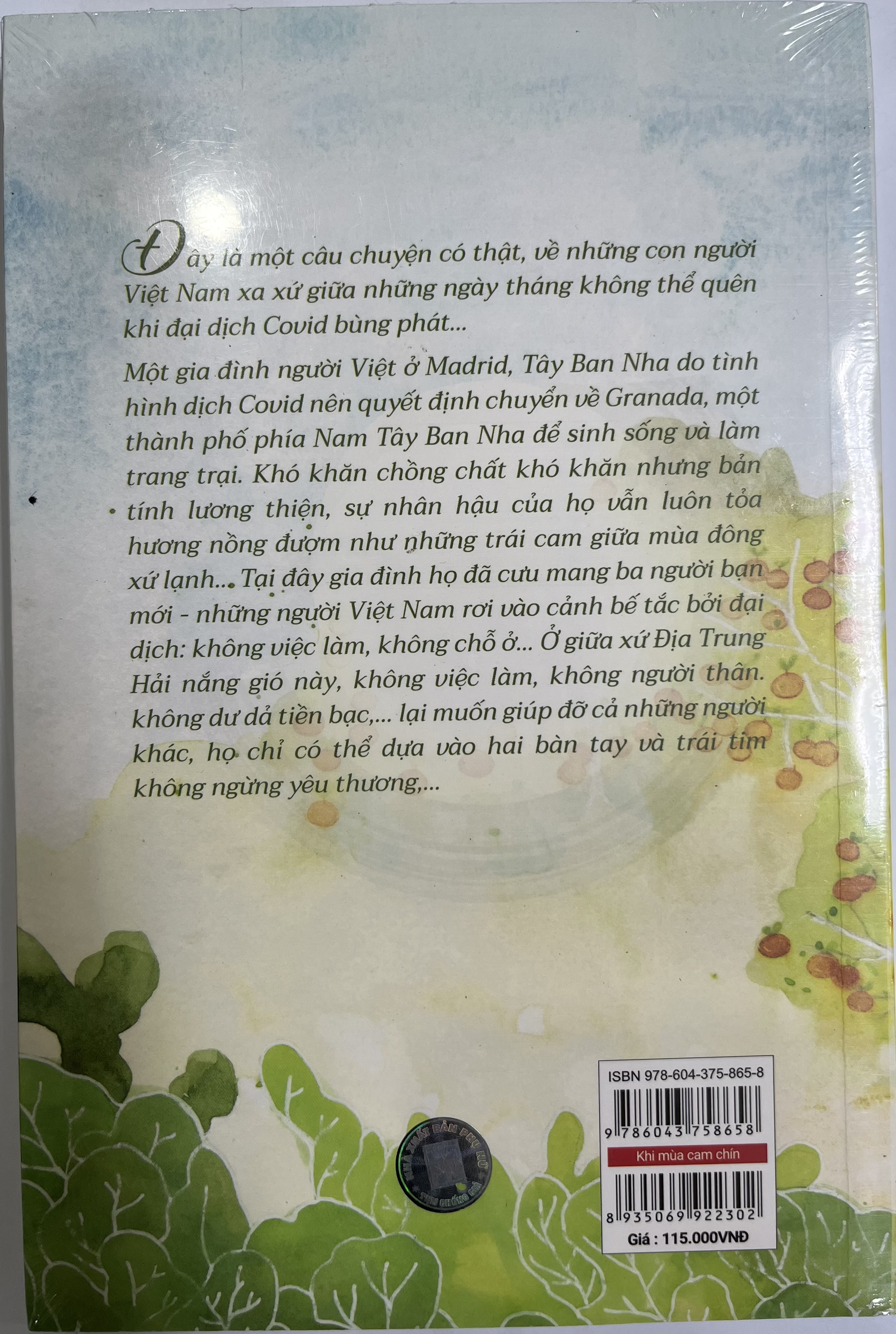 Đây là một câu chuyện có thật, về những con người Việt Nam xa xứ giữa những ngày tháng không thể quên khi đại dịch Covid bùng phát… Một gia đình người Việt ở Madrid, Tây Ban Nha do tình hình dịch Covid nên quyết định chuyển về Granada, một thành phố phía Nam Tây Ban Nha để sinh sống và làm trang trại. Khó khăn chồng chất khó khăn những bản tính lương thiện, sự nhân hậu của họ vẫn luôn tỏa hương nồng đượm như những trái cam giữa mùa đông xứ lạnh… Tại đây gia đình họ đã cưu mang ba người bạn mới - những người Việt Nam rơi vào cảnh bế tắc bởi đại dịch: không việc làm, không chỗ ở… Ở giữa xứ Địa Trung Hải nắng gió này, không việc làm, không người thân. không dư dả tiền bạc,… lại muốn giúp đỡ cả những người khác, họ chỉ có thể dựa vào hai bàn tay và trái tim không ngừng yêu thương,… Rồi cuộc sống của họ sẽ ra sao, những người bạn mới của họ sẽ thế nào? Hãy đọc Khi mùa cam chín để có thêm niềm tin vào tình người giữa cuộc đời đầy những gian nan, và cũng để không ngừng hy vọng vào một tương lai tươi sáng, khi mùa cam chín, tất cả chúng ta đều sẽ ổn và bình yên trở lại…