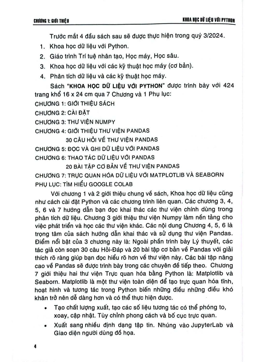 Khoa Học Dữ Liệu Với Python Sách Khoa học dữ liệu với Python được trình bày với 424 trang khổ 16 x 24 cm qua 7 chương và 1 phụ lục: Chương 1: Giới thiệu