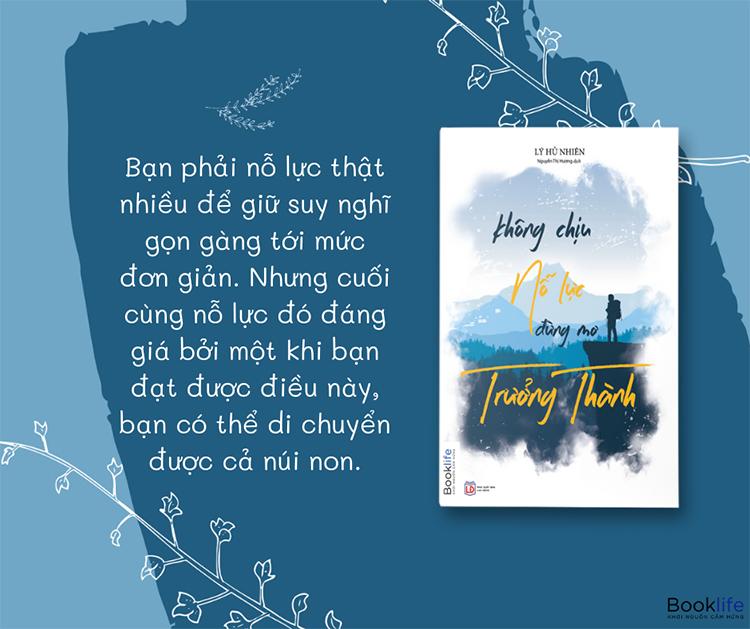 Mua tại TiktokMỗi người đều có một cái “kén” trói buộc mình, trước khi phá kén, đều sống cuộc đời giống như con sâu vậy. Cái kén này có thể là gia cảnh nghèo khó, là cuộc sống đơn điệu mỗi ngày, là những tiếng cãi lộn không điểm dừng của bố mẹ, là cuộc hôn nhân thất bại, là công việc không chút khởi sắc, là căn nhà có thể mãi mãi cũng không mua nổ Trong chiếc kén như thế này, nếu như chúng ta ngủ nướng, có thể chúng ta không hề cảm thấy khó chịu là bao, nhưng một khi chúng ta bắt đầu suy nghĩ thì sẽ lập tức cảm nhận được sự đau khổ khi bị trói buộc. Nó vây hãm chúng ta, khiến chúng ta không thể cử động, vì thế trong cuộc sống có vô số lần chúng ta rơi vào bế tắc, chỉ biết thở dài mà không biết tương lai rồi sẽ ra sao. Làm thế nào chúng ta mới có thể phá kén mà giương cánh bay cao, thật sự trải nghiệm được cảm giác tự do bay lượn giữa đất trời bao la? Không chịu nỗ lực đừng mơ trưởng thành sẽ giúp bạn giải đáp câu hỏi ấy. Chúng ta cần phải khắc phục ảnh hưởng của ngoại cảnh, khắc phục sự do dự, lười biếng, băn khoăn và lo lắng. Bất kể thế giới bên ngoài có biến hóa như thế nào, người có tinh thần tự thúc đẩy, cuối cùng đều sẽ nghe theo trái tim mình, cho dù đối mặt với tình trạng biến hóa nhanh chóng thế nào đi chăng nữa, rơi vào hoàn cảnh khó khăn như thế nào chăng nữa, cũng sẽ âm thầm chịu đựng, một mình tiến về phía trước. Đời người có muôn vàn khả năng, bạn chỉ vì chút thoải mái trước mắt mà từ bỏ nỗ lực thì bạn thua rồi. Để bước lên được nấc thang của sự trưởng thành, chỉ có thể dựa vào nỗ lực. Đừng bao giờ làm một người đứng dưới chân núi ngẩng đầu nhìn lên trên đỉnh bởi khi đó dẫu cho bạn có rơi nước mắt thì cũng không ai nhìn thấy. Trưởng thành là không ngừng cố gắng, không ngừng nỗ lực, không ngừng kiên trì để vươn lên. Thông tin tác giả: Lý Hủ Nhiên là VVIP trên diễn đàn Zhihu, có hàng triệu fan hâm mộ. Tài khoản cá nhân “Hủ tiên sinh” được Notesandbox và Newrank đánh giá là “một trong mười tài khoản Wechat đáng giá nhất” trong lĩnh vực kỹ năng nơi công sở. Sáng tác rất nhiều tác phẩm hot có danh tiếng tốt, được chia sẻ trên tường của các tài khoản lớn như Nhật báo Nhân dân, Youshu, Duzhe, Master I