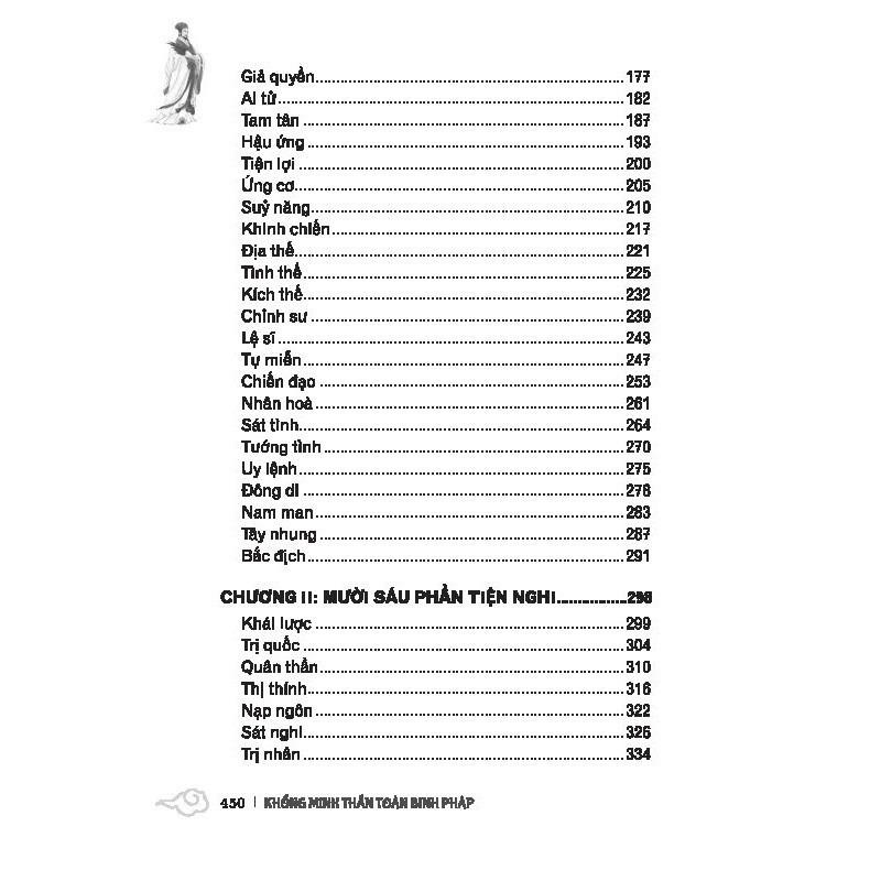 Khổng Minh Thần Toán Binh Pháp gồm 3 chương lớn ,mang đến những mưu lược, chiến thuật quý giá từ nhà quân sư tài ba Gia Cát Lượng Khổng Minh.