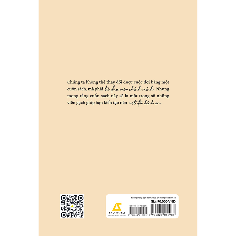 Không Mong Bạn Hạnh Phúc Chỉ Mong Bạn Bình An - Đôi nét về tác giả Hiên Hiên là một tác giả Việt trẻ và tài năng, đã từng xuất bản nhiều tác phẩm đậm chất tình yêu, bay bổng và lãng mạn, nhận được sự yêu mến của đông đảo độc giả trẻ và hiện đại. Khác với những cuốn sách trước đây, cuốn sách này sẽ hướng đến những giá trị tinh thần về lối sống nhiều hơn, đưa độc giả đến với một Hiên rất khác - một cô gái vô cùng mộc mạc, bình thường, cũng có rất nhiều lo âu, mỏi mệt và khó khăn trong cuộc đời. Hy vọng những góc nhìn, phương pháp của tác giả trong cuốn sách này sẽ giúp độc giả phần nào bồi đắp được cho bản thân những kỹ năng để sống đời mình một cách tốt hơn. - Nội dung chính của sách: Cuốn sách bao gồm 5 phần chính, mỗi phần đều chứa đựng những trăn trở, nỗi niềm của tác giả và đồng thời đưa ra những quan điểm, lời khuyên chân thành của mình để hướng mọi người đến với sự hạnh phúc và bình an trong nội tâm: + Những đau khổ đầu tiên: “Nếu không có đau khổ, chúng ta cũng sẽ không biết và trân trọng hạnh phúc.” Cuộc đời chúng ta sẽ vì một vài đau khổ mà chậm lại và đôi khi là không thể vượt qua được, nhưng ta vẫn có thể từ từ tìm cách để giải quyết và thay đổi nó. Nếu có một ngày chúng ta cảm thấy bế tắc và mỏi mệt, điều đầu tiên mà tác giả khuyên bạn nên làm đó là “ngắt kết nối”. + Những nút thắt của tôi: Ai cũng có những nút thắt của riêng mình, và Hiên - cũng như bao cô gái bình thường khác - cảm thấy khoảng thời gian khủng hoảng nhất là khi ở trong một mối quan hệ không rõ ràng. Và từ đó cô đã tìm hiểu thêm về “con đường tâm linh”, tiến sâu vào trong nội tâm để hiểu mình hơn. + Ai cũng có những điều rất xấu xa: “Một trong những điều khiến chúng ta chối bỏ những điều chưa tốt của bản thân, đó là việc thừa nhận mặt xấu và điểm yếu của mình.” Khi nhận ra được những điểm yếu của bản thân, chúng ta cần hướng đến những phương pháp để điều chỉnh tâm lý, thiết lập những tư duy mới và làm chủ được hành vi của mình. Thật sự nhẹ nhàng với lựa chọn của bản thân, tránh những cảm giác tồn đọng chìm sâu trong lòng. + Chánh niệm: Sau khi điều chỉnh lại tâm lý, chúng ta cũng cần phải kiểm soát và thực hành để rèn luyện tâm trí. Và chánh niệm là phương pháp chúng ta nên dùng trong đời sống để có thể tập trung cũng như đạt tối đa hiệu quả sống của mình. + Khôi phục kết nối: Cuốn sách bắt đầu bằng “ngắt kết nối” - tìm về bên trong để hiểu về bản thân và sửa chữa những điểm có vấn đề của chính mình, và dừng lại ở việc “khôi phục kết nối” - trở lại và tiếp tục kết nối với những mối quan hệ cũ, những câu chuyện còn dang dở và những trách nhiệm trong đời sống, khởi động lại chúng để thực sự trải nghiệm và sống cho ra sống mỗi ngày. Hy vọng thông qua cuốn sách “KHÔNG MONG BẠN HẠNH PHÚC CHỈ MONG BẠN BÌNH AN”, độc giả sẽ tìm ra được ánh sáng và sự bình yên cho chính mình giống như những gì mà tác giả gửi gắm thông qua tiêu đề của cuốn sách. Và cũng hy vọng rằng, cuộc sống này sẽ luôn dịu dàng với bạn.
