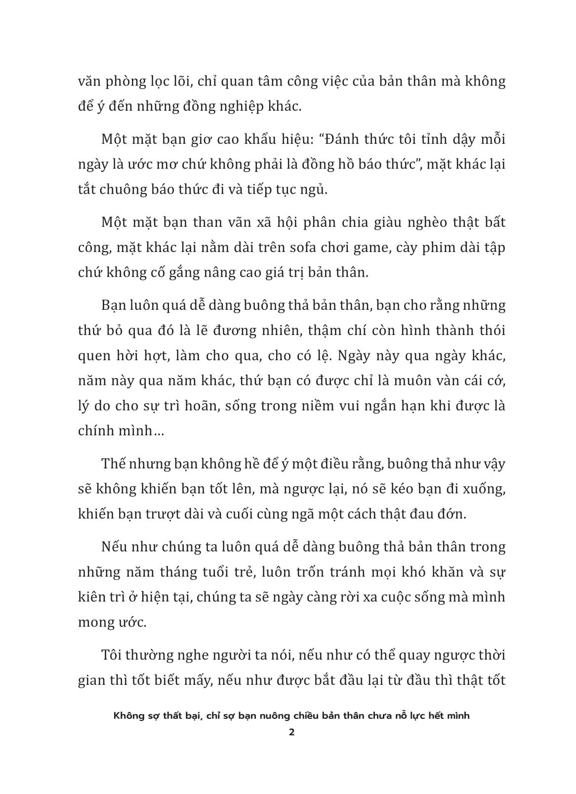 Không ai huênh hoang vài câu là có thể thành công ngay được. Cuộc sống vốn có những thử thách bất ngờ, nếu mệt thì nghỉ, sai thì làm lại, tuyệt đối đừng bỏ cuộc vì sự hài lòng dễ dãi. Buông bỏ chính m.ình trong lời oán than thì dễ, nhưng để cuộc đời buông tha m.ình mới khó.